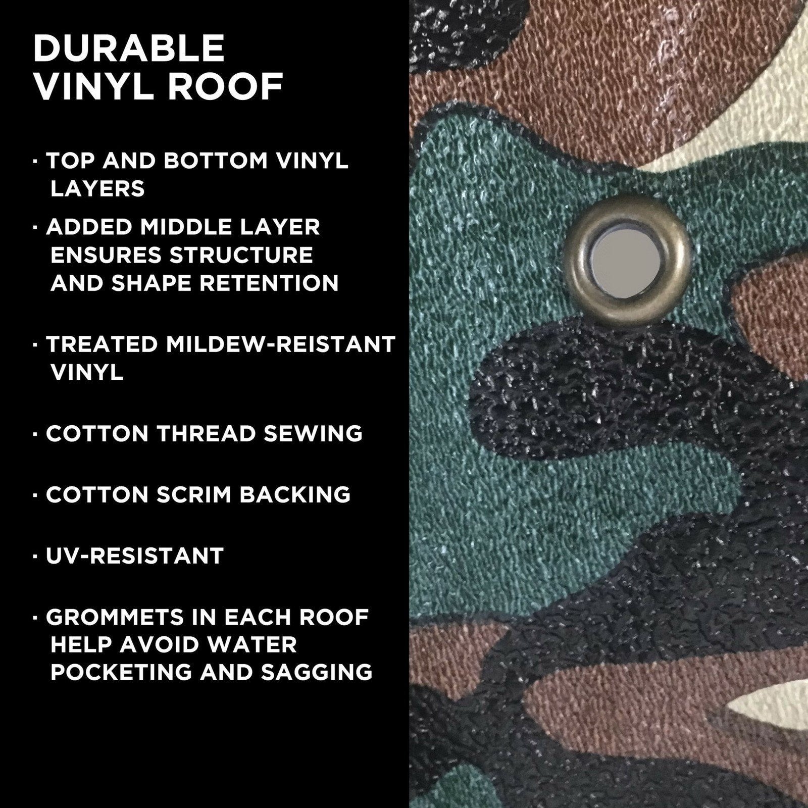 - Tough triple layer vinyl roof resists mildew with heavy duty grommets that prevent water pocketing and sagging