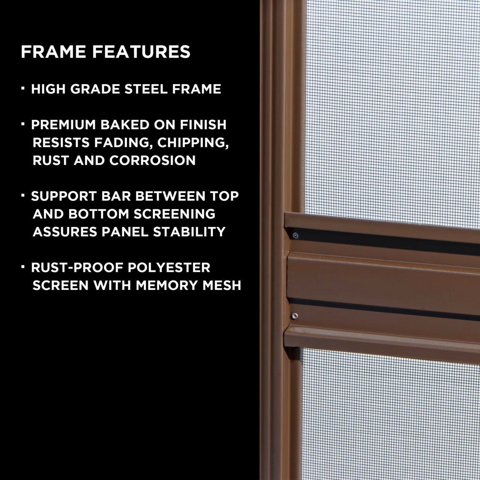 Standard swing out door is hinged on the right hand side and can be positioned anywhere. There are 12 panels each, 45-inch wide by 75-inch high. The support bar at the halfway point on the inside of the screen panels provides panel stability while the top and bottom are held stable with a patented cable retainer system. Heavy-duty galvanized cold rolled steel frame with baked-on architectural finish resists fading and oxidation. Roof is detachable for easy maintenance, storm removal and winter storage. The screen house itself has a simple fold-down capability allowing for easy storage during the winter. Instructions, anchor bracket kit, threshold included.