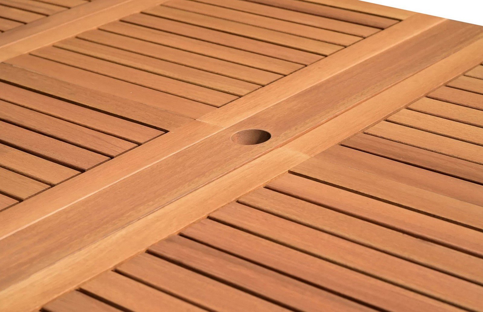 Amazonia Marlene 11-Pc. Teak Double Leaf Extendable Patio Dining Set Enjoy your patio with the Amazonia Marlene 11-Pc. Teak Double Leaf Extendable Patio Dining Set. As part of the Amazonia outdoor collection, this elegant design is made using 100% from FSC certified eucalyptus wood. This outdoor collection is resistance to weather and UV radiation which makes these products durable and enjoyable in any outdoor environment. Features: