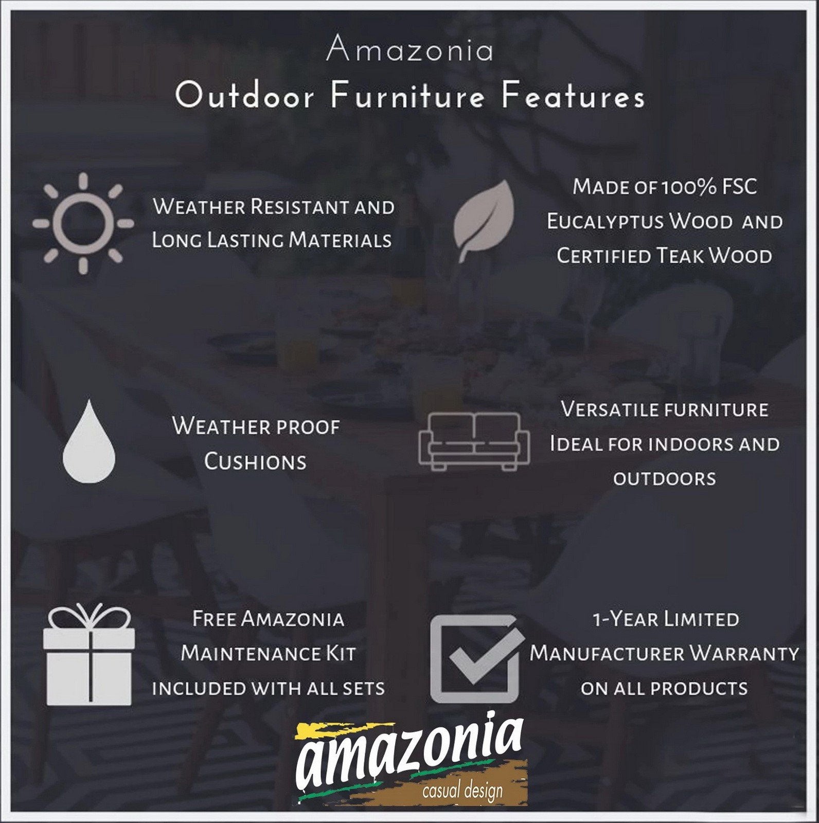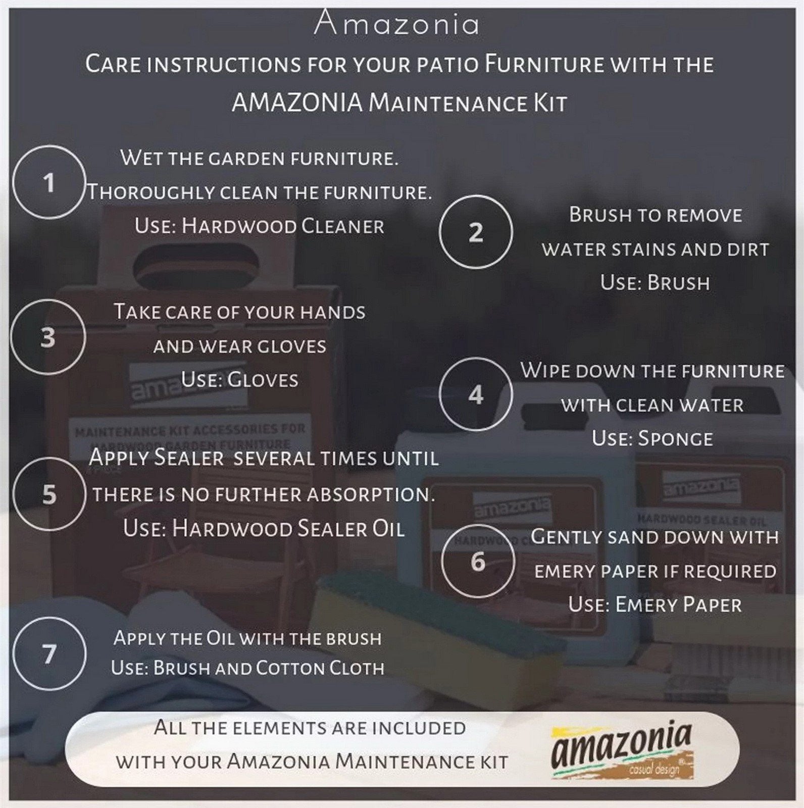 - Free Amazonia Maintenance Kit included with this set. Apply the first coat of sealer after assembly and thereafter re-apply up to four times a year or as needed. This process will help maintain color and prolong durability.