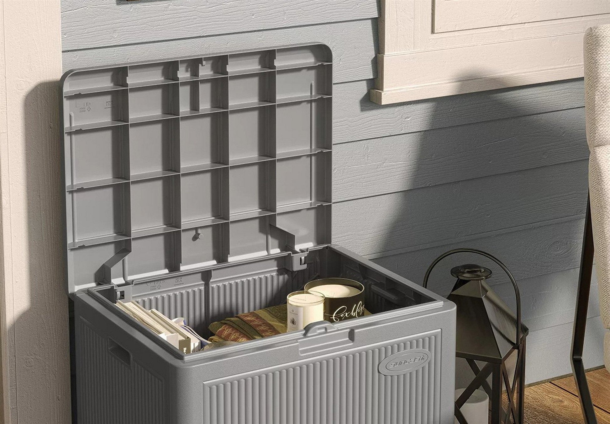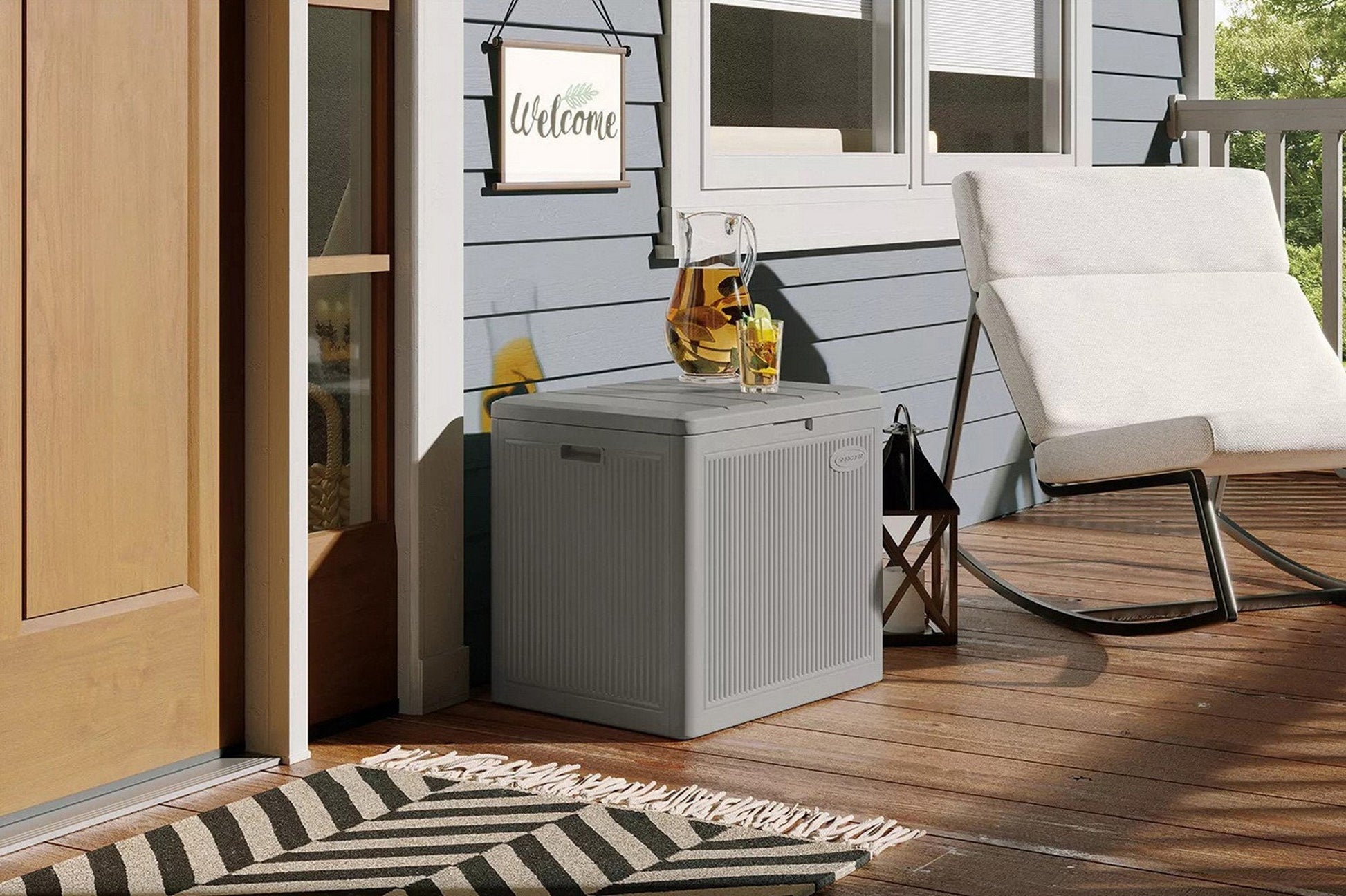 The 22 Gal. Small Outdoor Resin Reeded Deck Box is stylish, functional and perfect for stashing away outdoor accessories on you patio or cold weather gear inside your laundry room or garage. It features built-to-last, weather-resistant resin construction that allows for year-round use and easy maintenance. Regardless of your unique needs, this stylish deck box will make a great addition to your home.