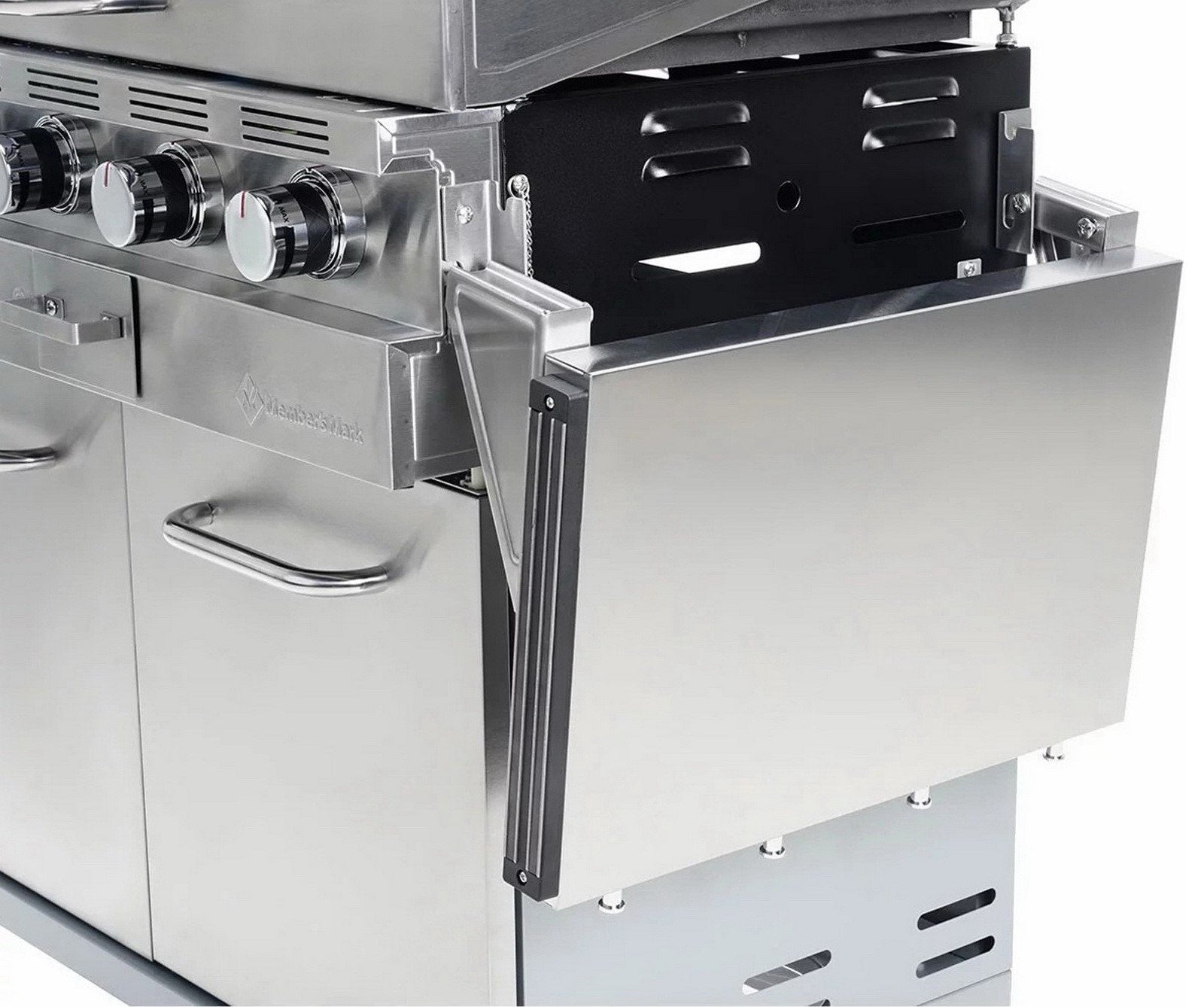 - Space-saving, foldable stainless steel side shelves