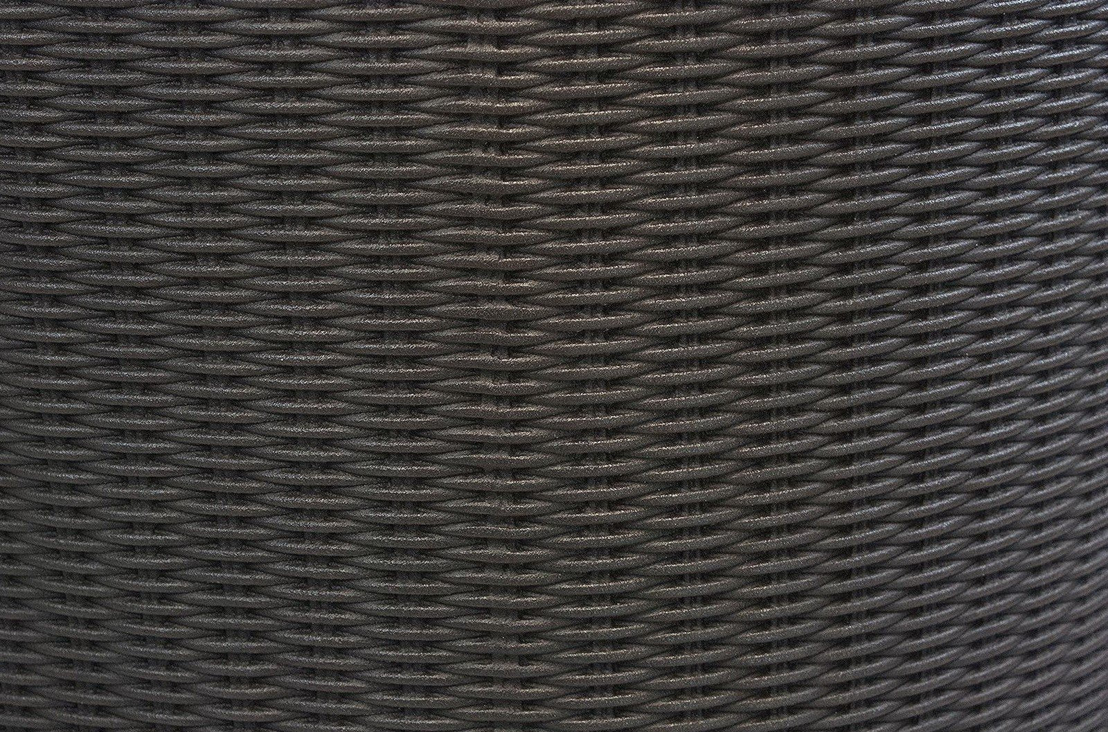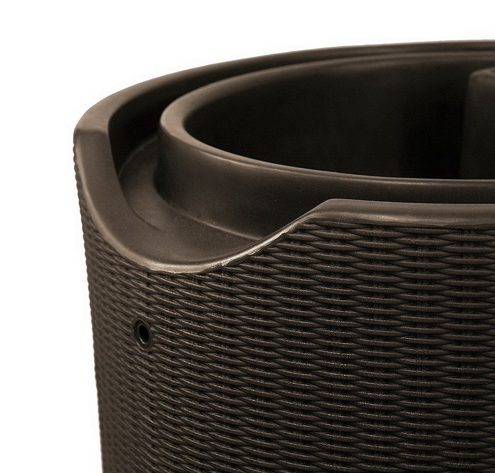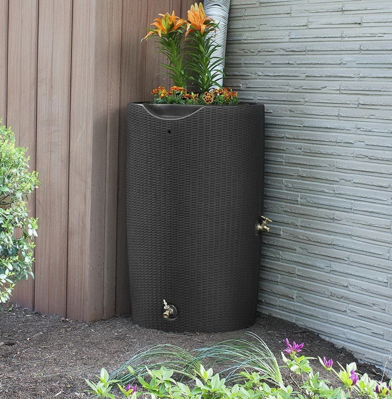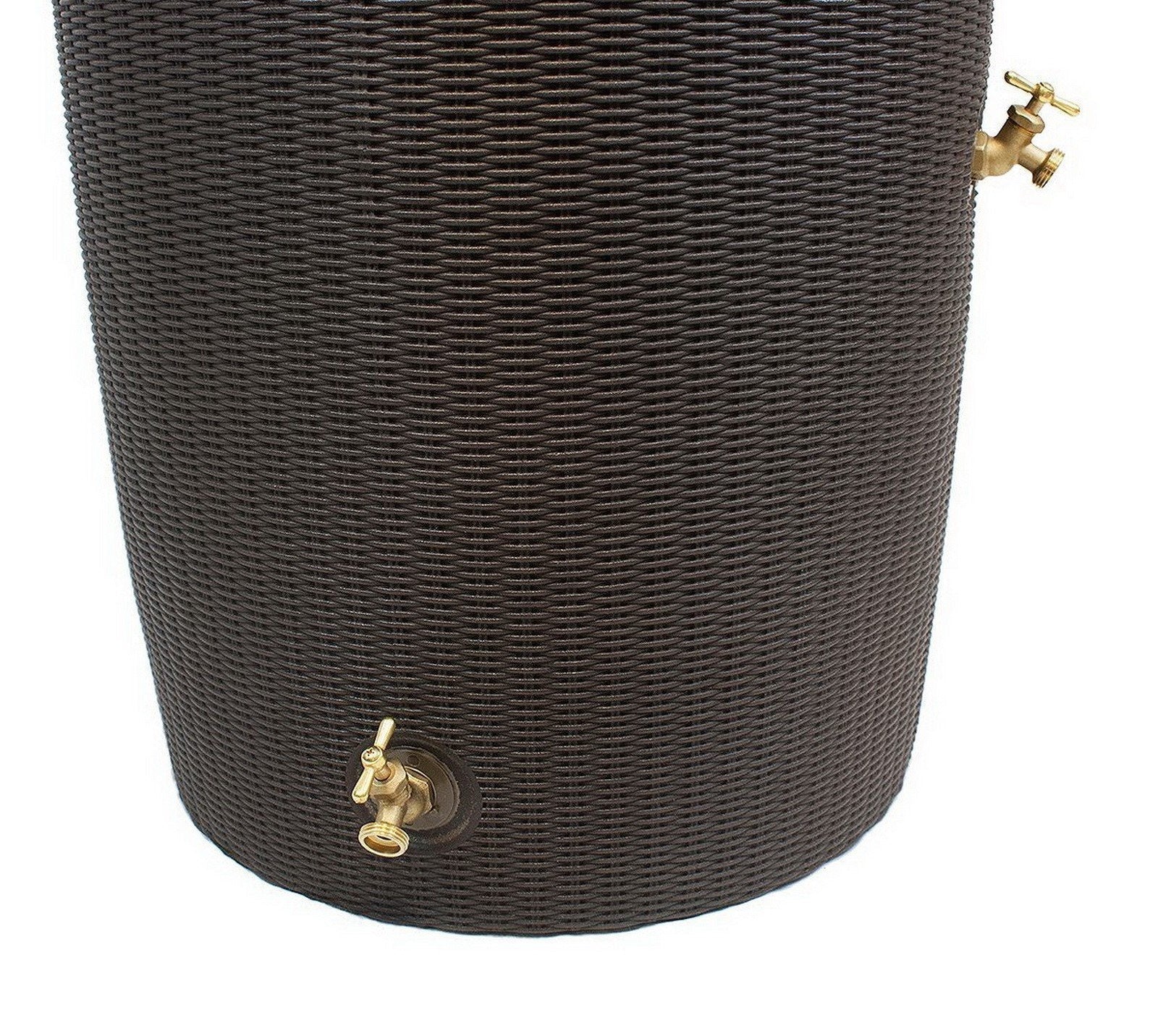 Designed with a deep-welled top for displaying herbs or floral arrangements, this 50-gallon rain barrel features a mesh strainer, dual spigots and an attractive rattan weave.