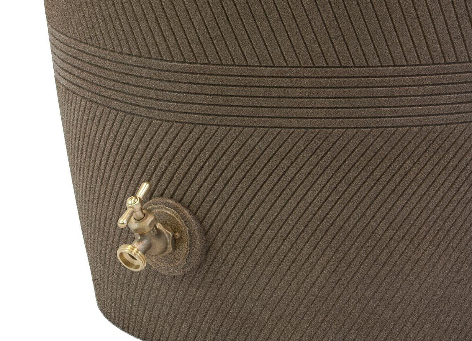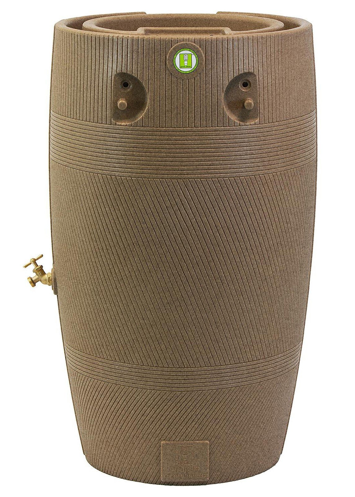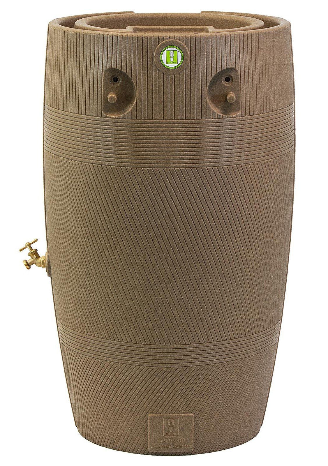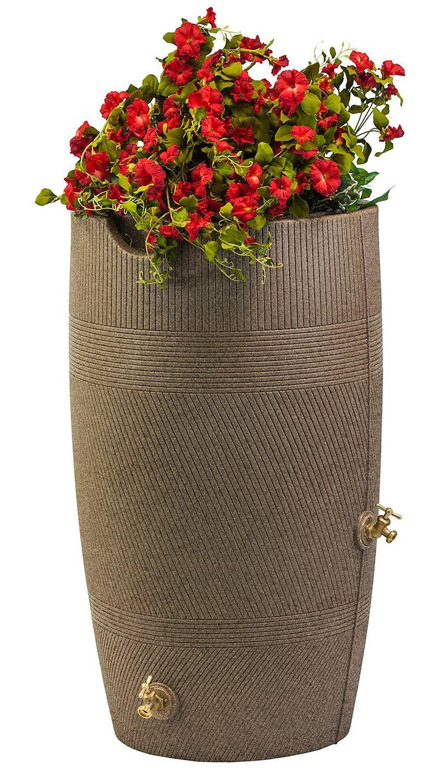 The 50 Gallon Rain Barrel Portable Water Collector Brass Spigot Planter Top reinvents how you harvest rain water. The 50 Gallon Rain Barrel Portable Water Collector Brass Spigot Planter Top design is sturdy and one of the most eye-catching rain barrels on the market. Its clean surface, with multi-directional lines, creates a unique texture adds interesting aesthetics as opposed to a plain utility product. With a deep welled top, you can plant an array of floral arrangements or even a small herb or vegetable garden. The top also includes the Good Ideas an original, integrated overflow channel. This channel automatically diverts all overflow water to the front of the barrel and keeps your foundation from flooding. The large opening, which can be used for 2 x 3 or 3 x 4 downspouts, is covered with a soft fine mesh, plastic screen. This screen keeps out heavy debris and insects for piece of mind. Also included with the barrel are two, offset spigot locations. Now you can use a five-gallon bucket or hose simultaneously. Or use the second spigot as an overflow into a second barrel. So many features make this rain barrel extra useful and convenient.