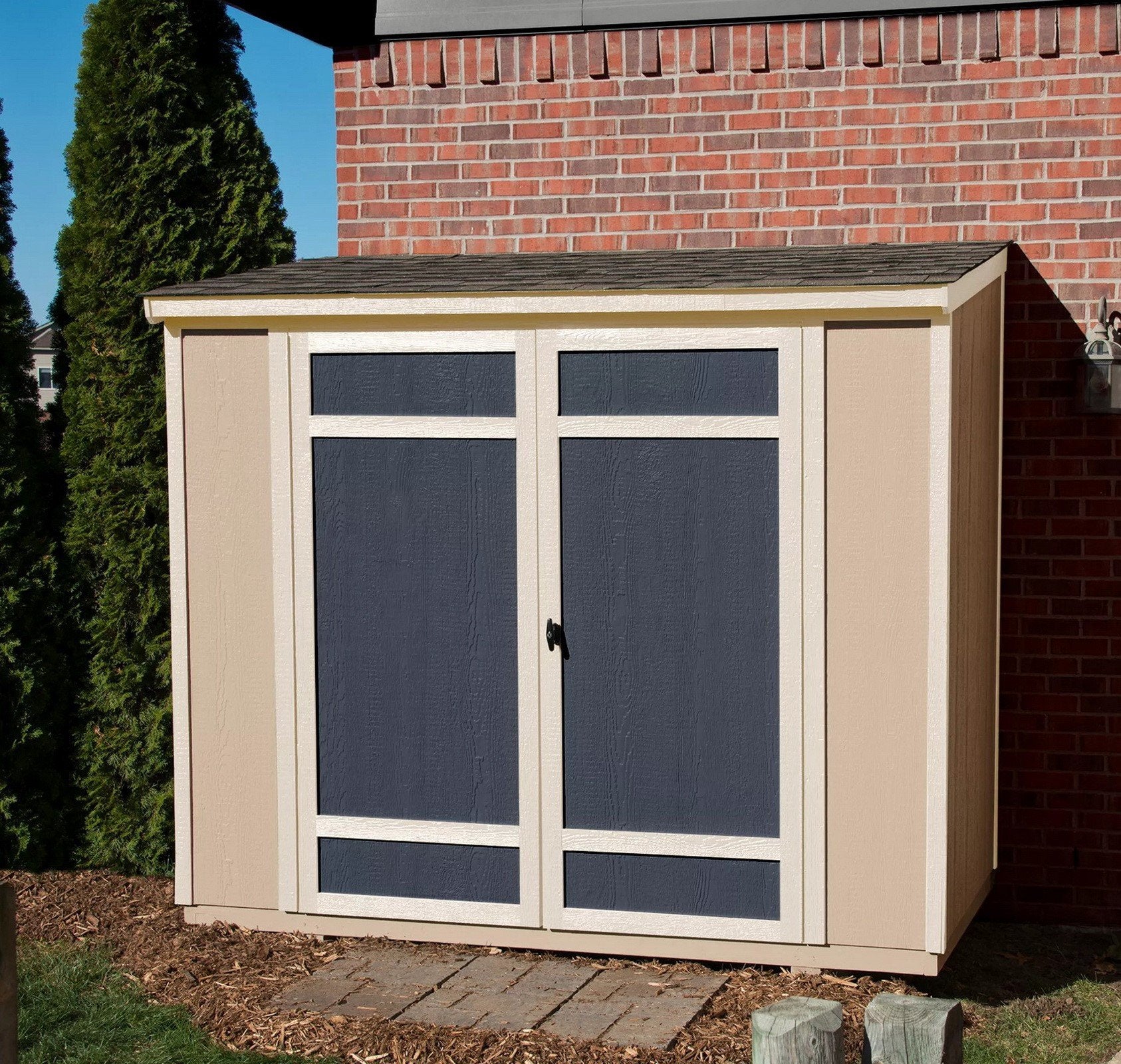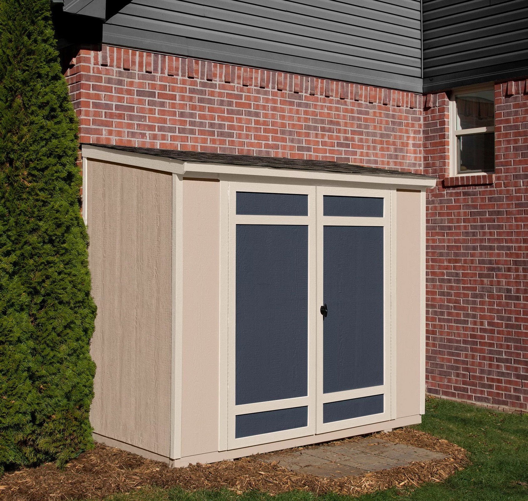 Handy Home 4' x 8' Heavy Duty Wooden Lean-To Storage Shed The Handy Home 4' x 8' Heavy Duty Wooden Lean-To Storage Shed is the perfect storage companion for those seeking additional storage space without sacrificing yard space. It has a 64” wide door opening so you can easily access lawnmowers and wheelbarrows. The strong wood frame construction allows you to add your own shelves, pegboards, and hooks as needed. Smartside siding provides excellent weather and insect resistance so your shed can last for many years to come. The Fremont is everything you’d expect in a lean-to shed – small, practical, and attractive. Features: