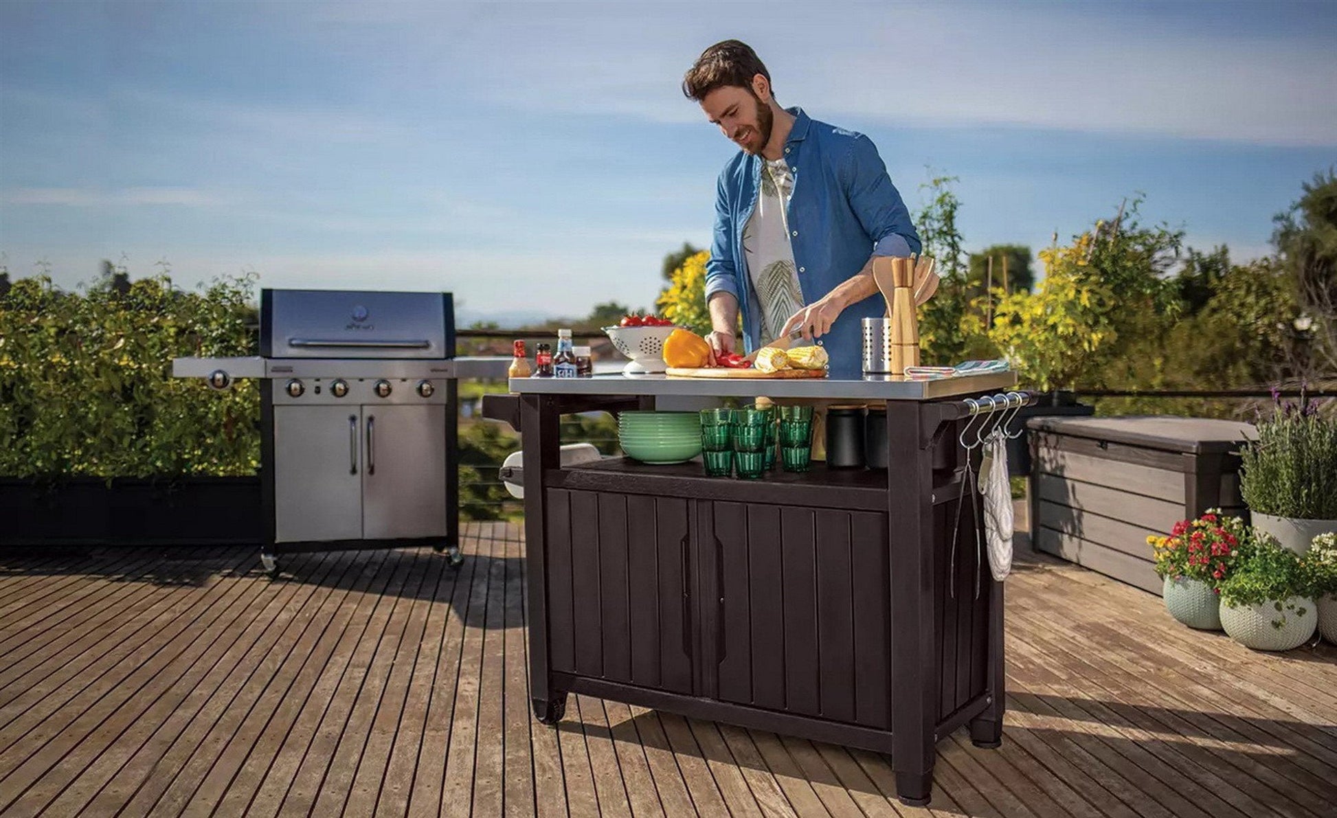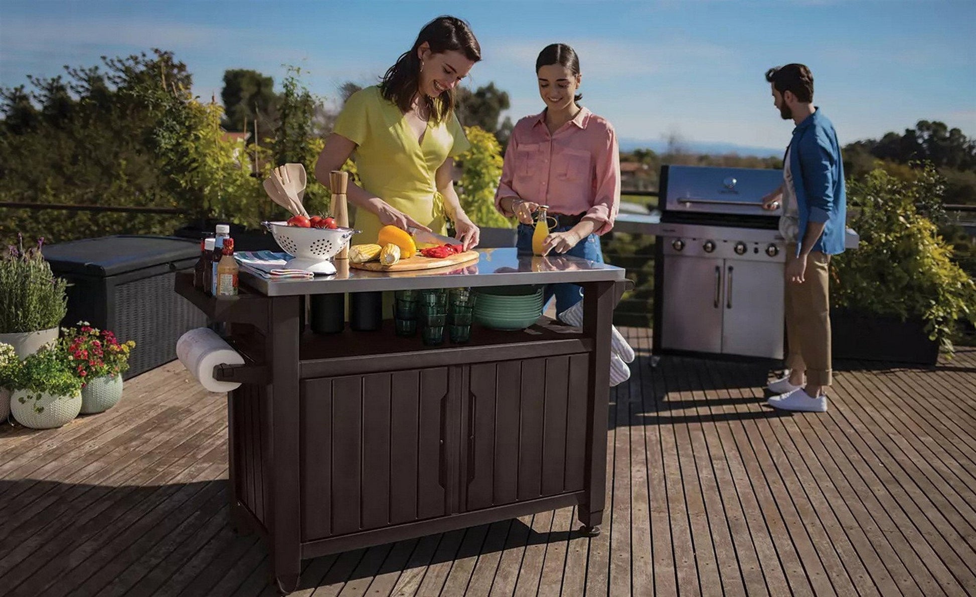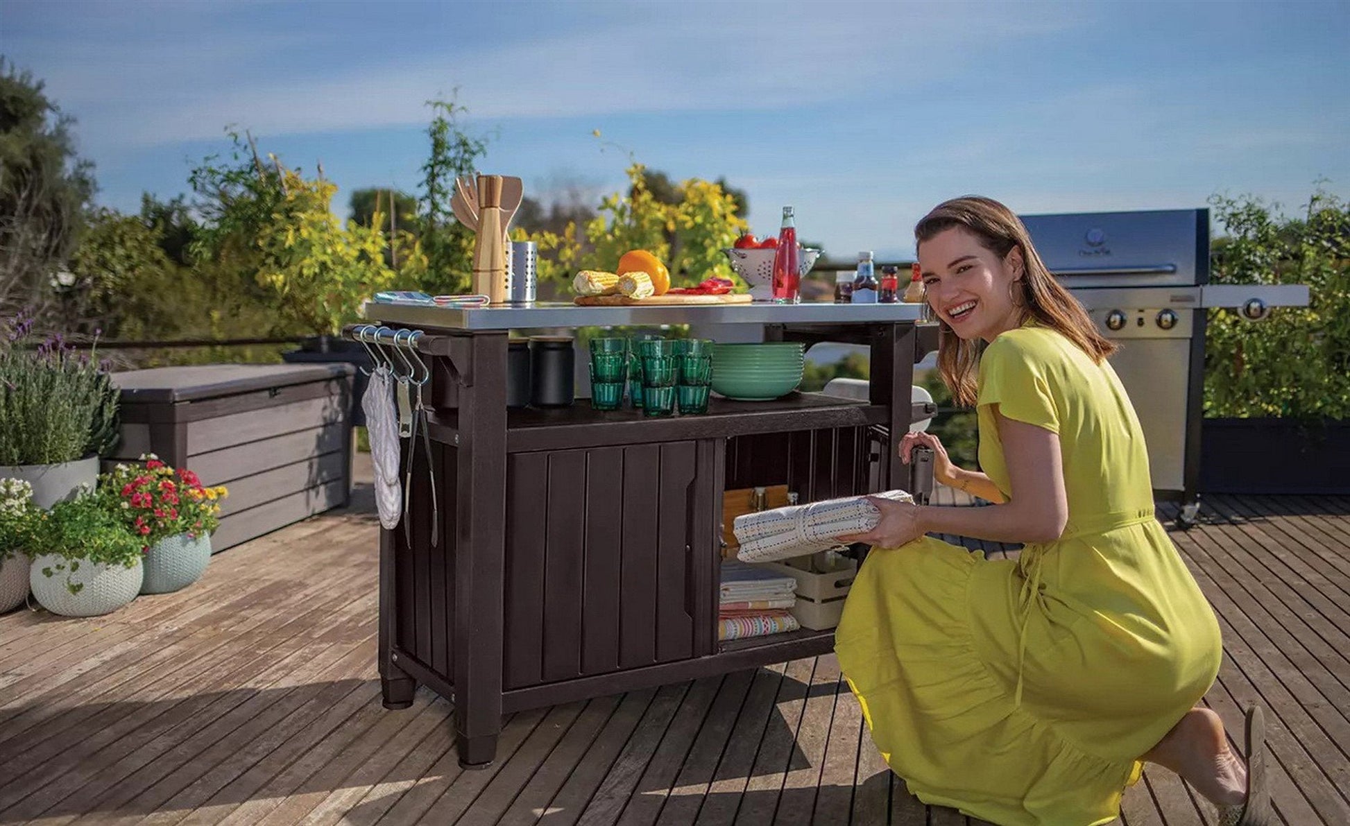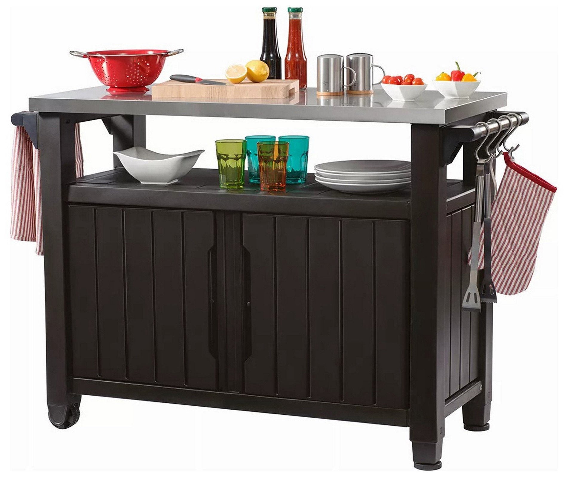 The Keter Outdoor Entertainment Storage Station Bar & Grilling Table is your all-in-one solution for your backyard. This multipurpose station allows you to perform a variety of uses from prepping food for the grill to a serving table or gardening station—while staying close to your guests and family. In addition, it offers storage for cookware, patio accessories or gardening supplies.