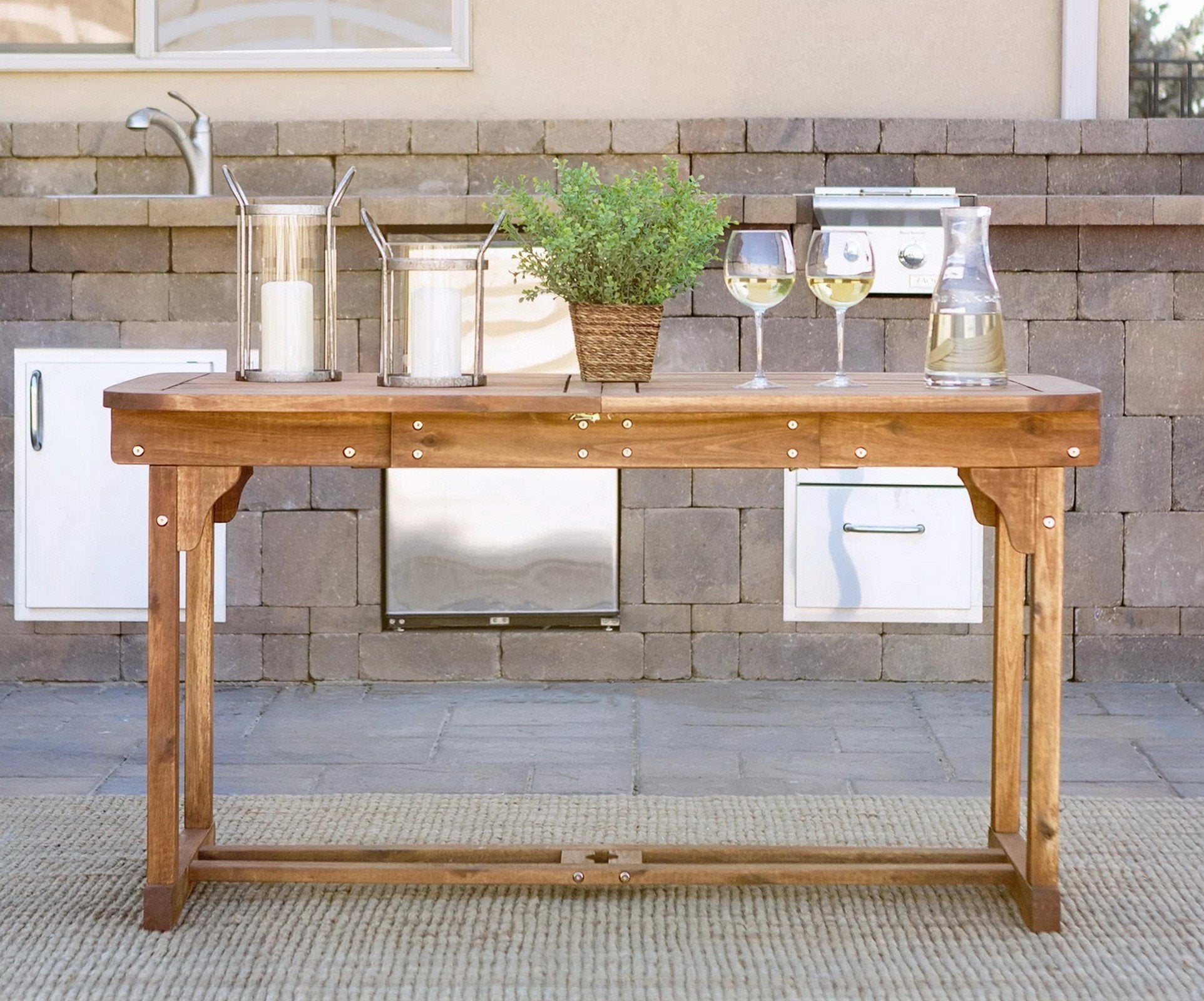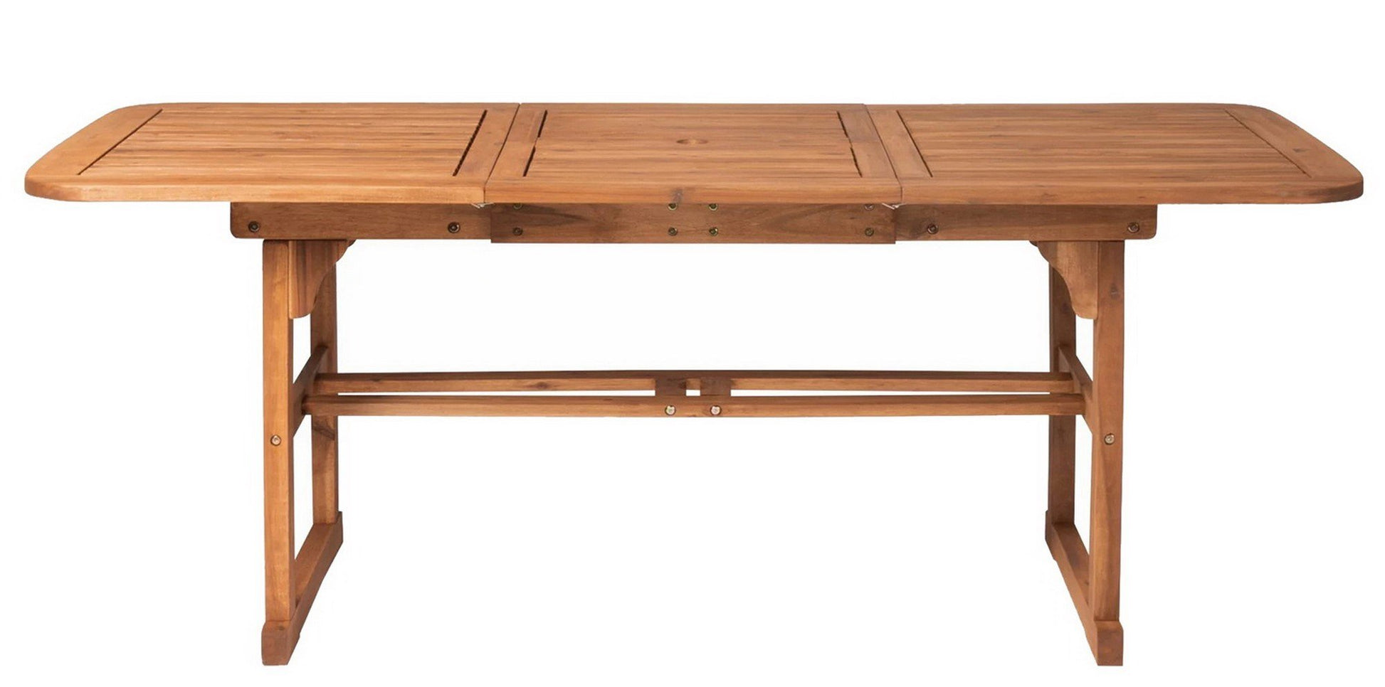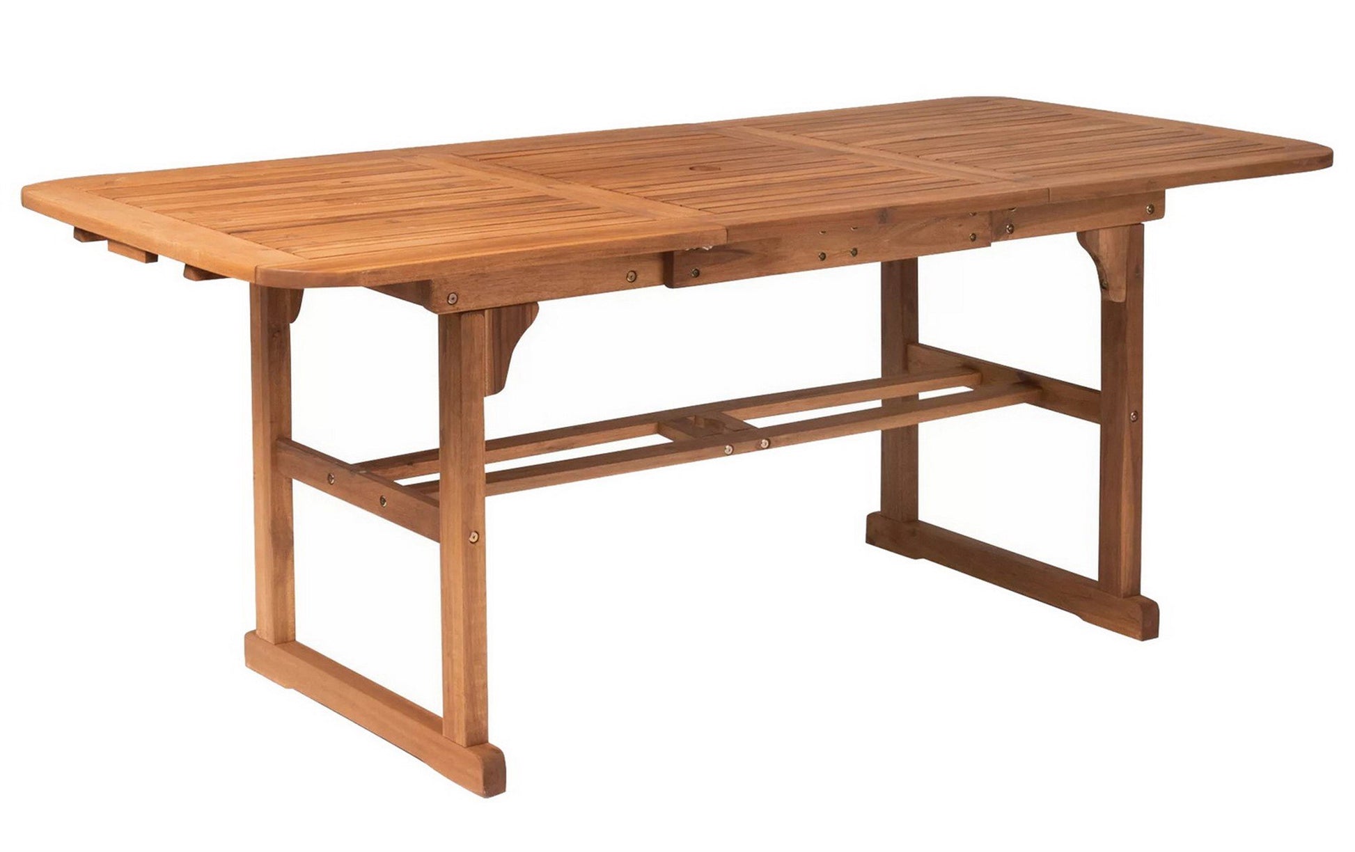 With the Outdoor Extendable Acacia Wood Dining Table Hardwood 35" x 55" to 79" With Leaf, you'll have no trouble hosting every summer party at your house. This large hardwood table comes equipped with a hideaway butterfly leaf to accommodate large gatherings. Plus, the natural wood-grain finish and shine deliver a touch of charm that's easy to integrate into any sunroom, patio or deck.