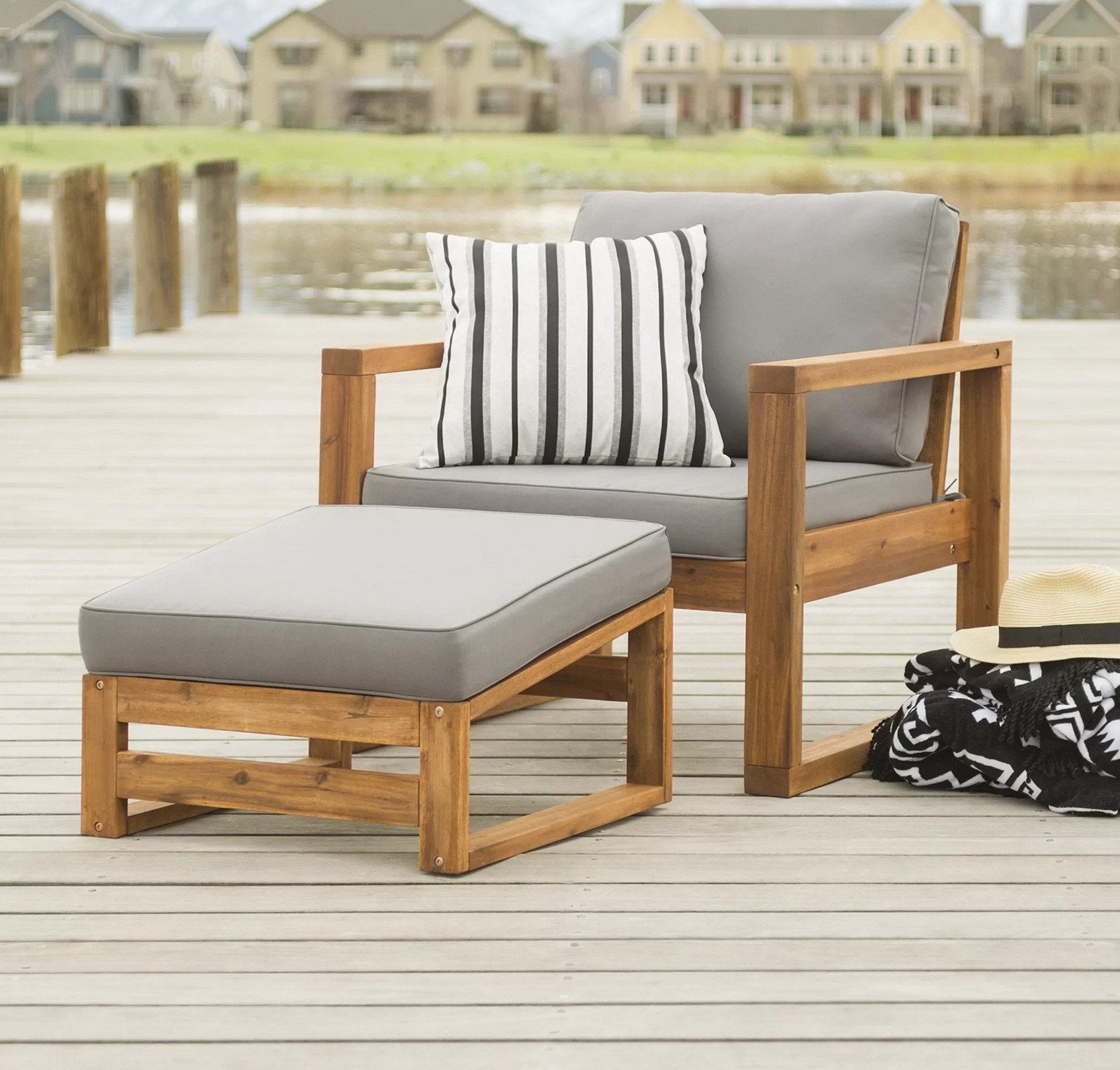 Relax under the warm summer sun in this gorgeous and comfortable Outdoor Weather Resistant Arbor Acacia Wood Chair Ottoman With Cushions. Featuring soft cushions and durable-yet-stylish acacia wood, this is truly a winning combination..