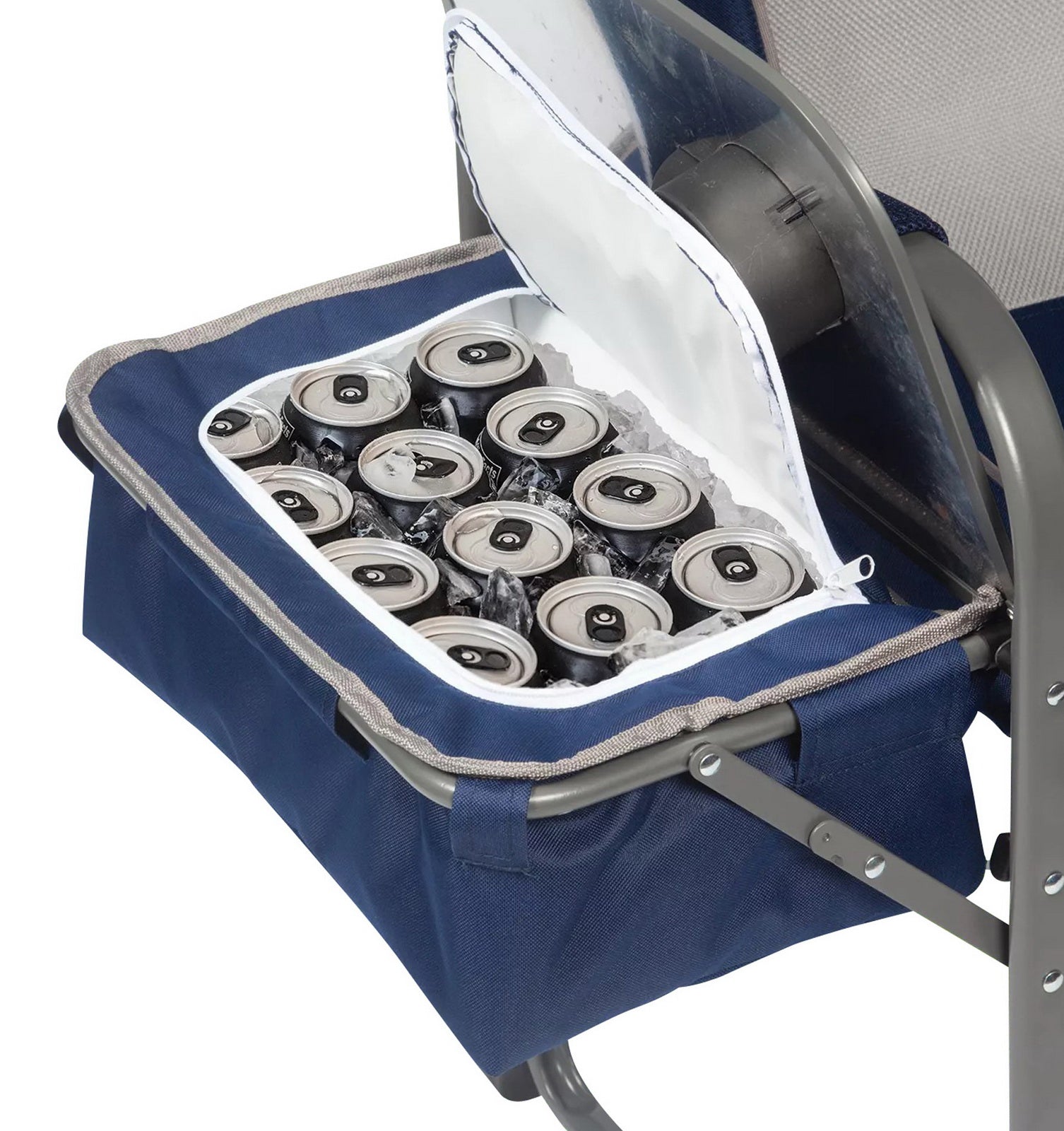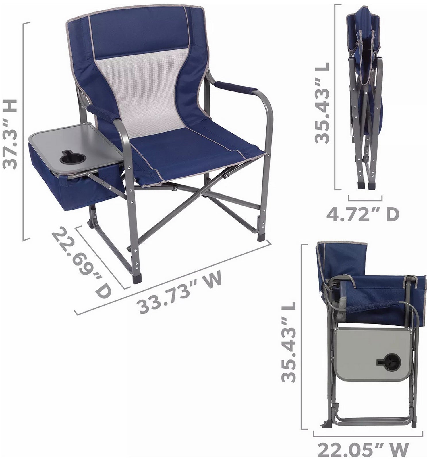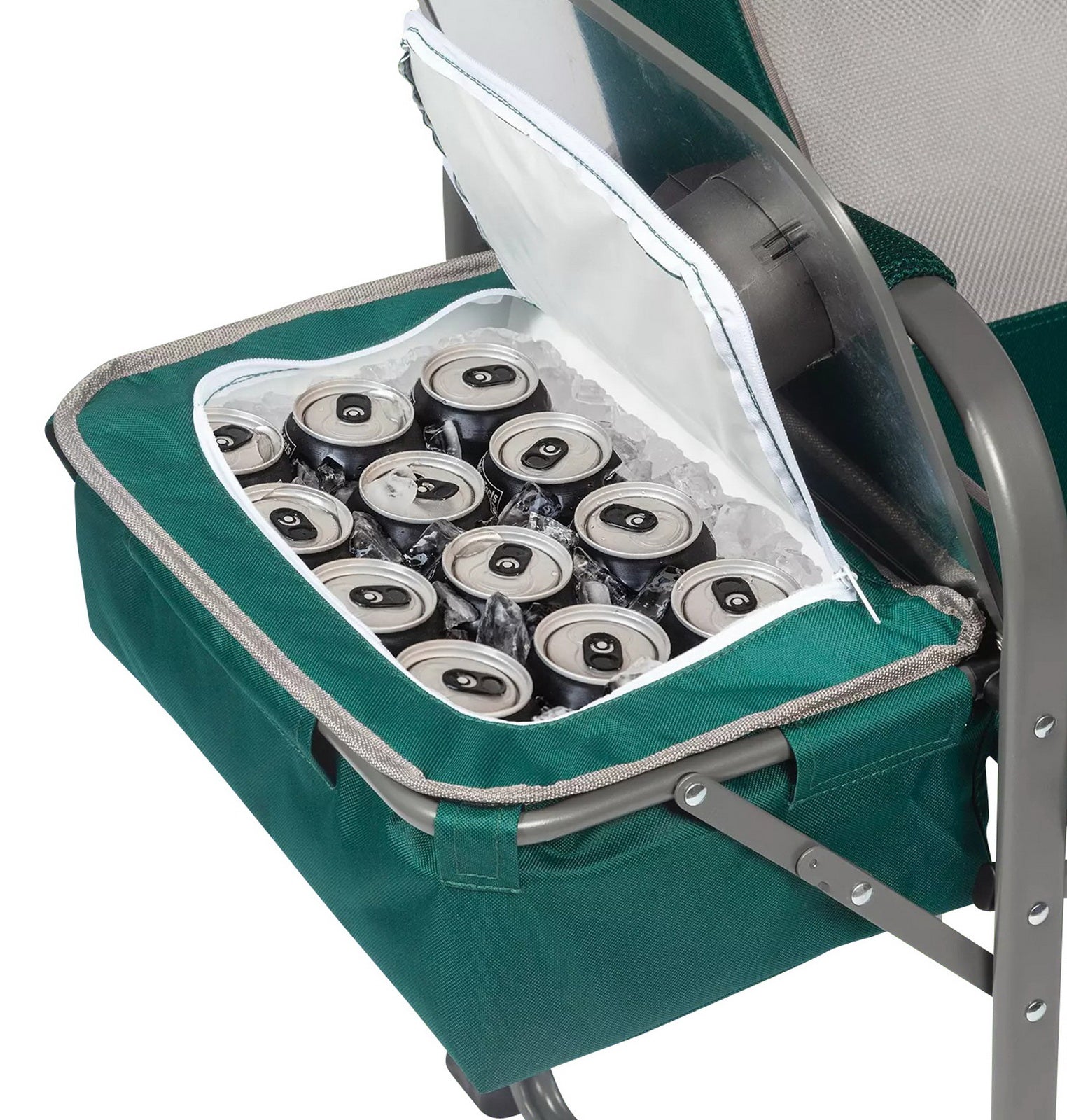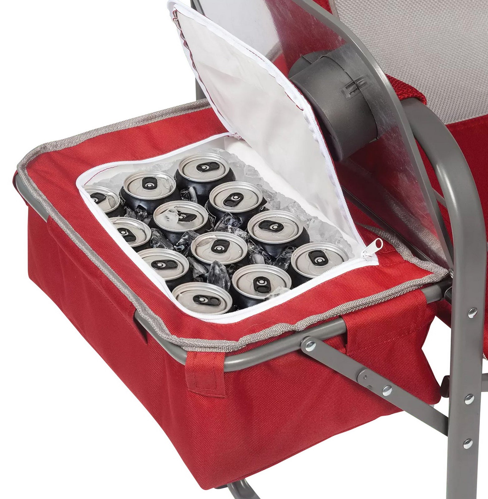 Relax in comfort at your next family gathering, sporting event or BBQ in the Oversized Director's Chair. With a convenient 12-can capacity, fold-awaay insulated cooler and side table with a drink holder for a beverage, letting you stay refreshed wherever you go. This chair is the ideal accessory for all your outdoor activities including tailgating, parades, ball games, and camping.