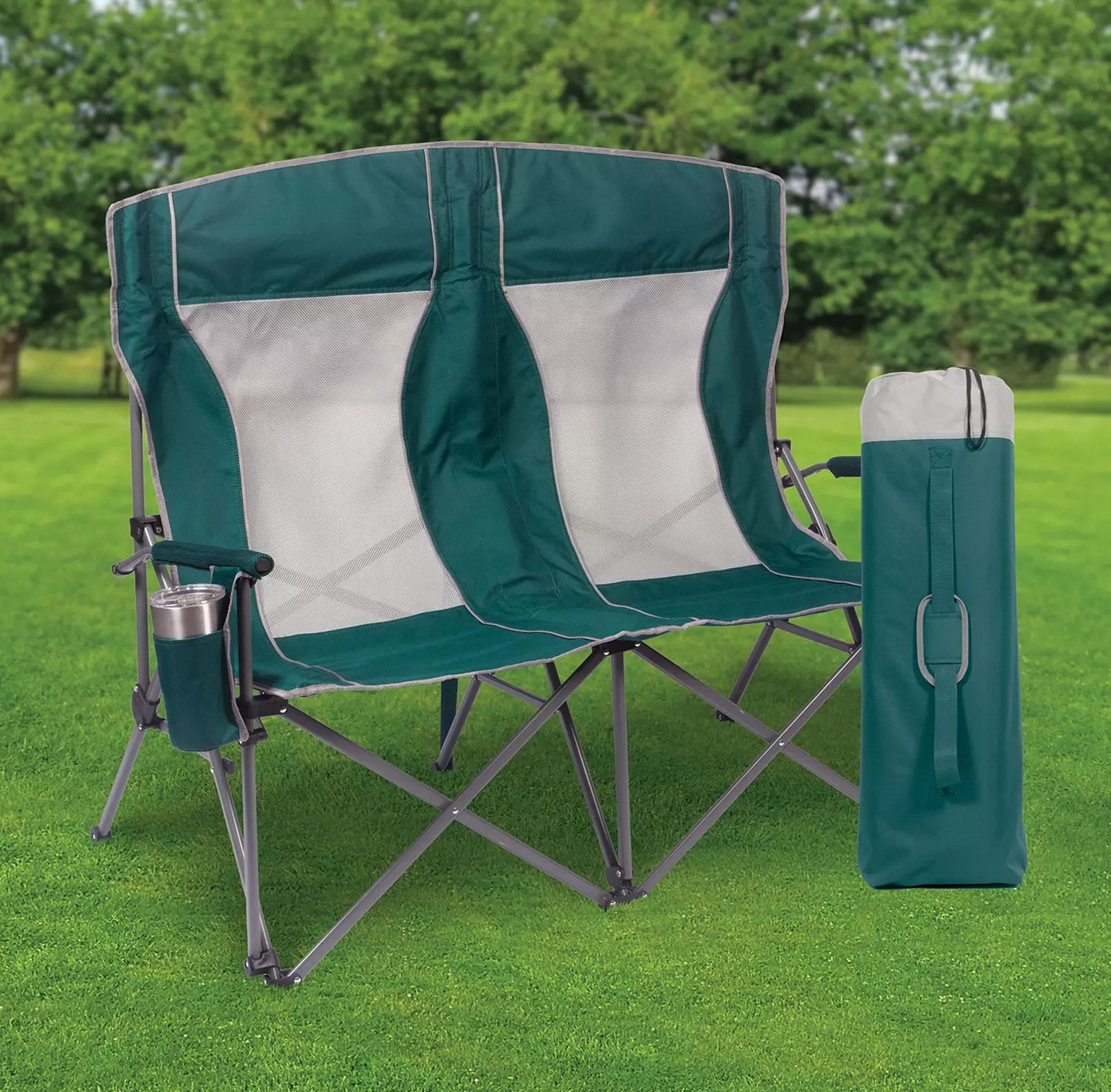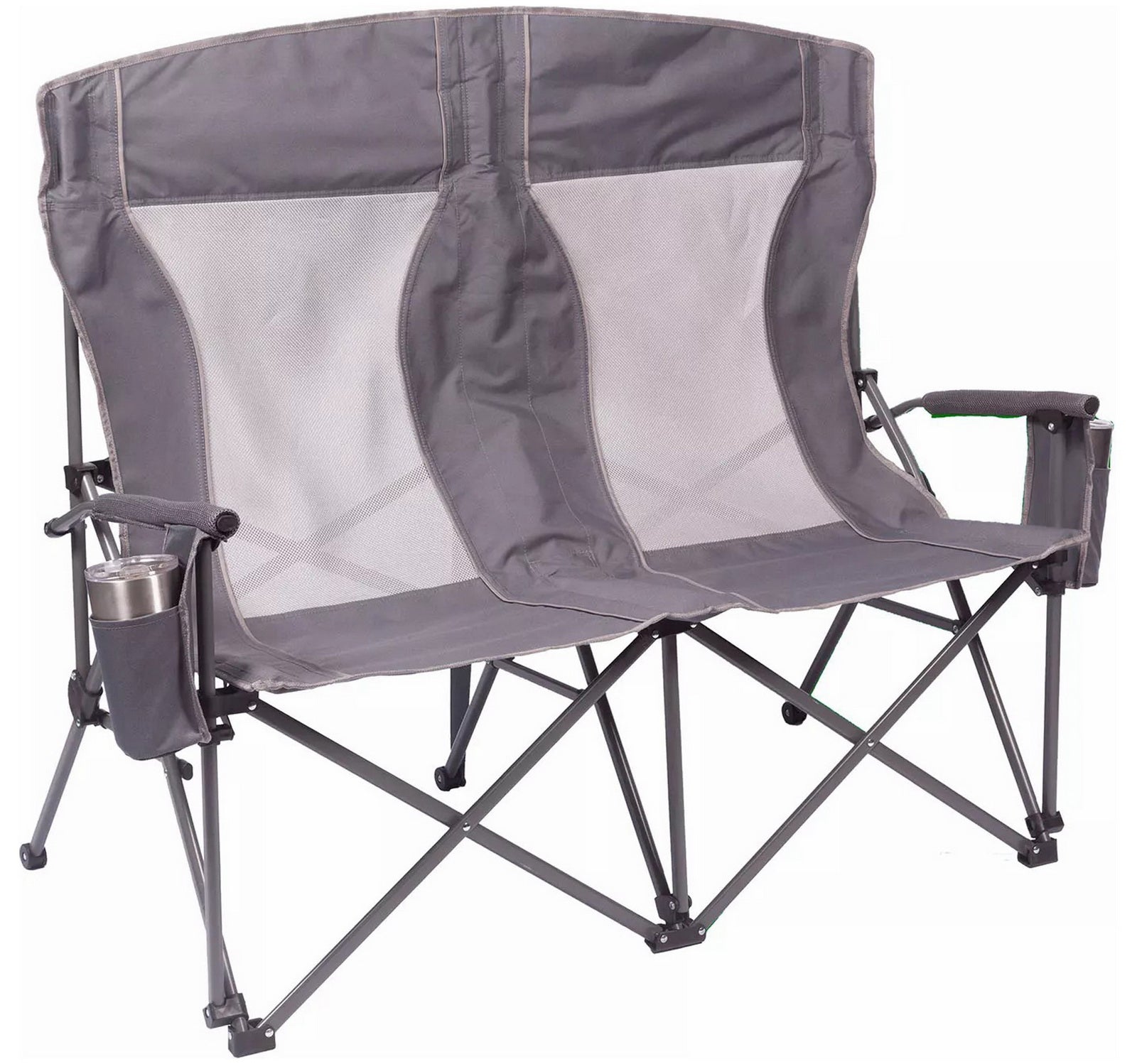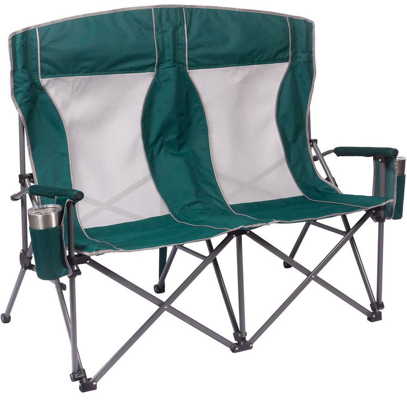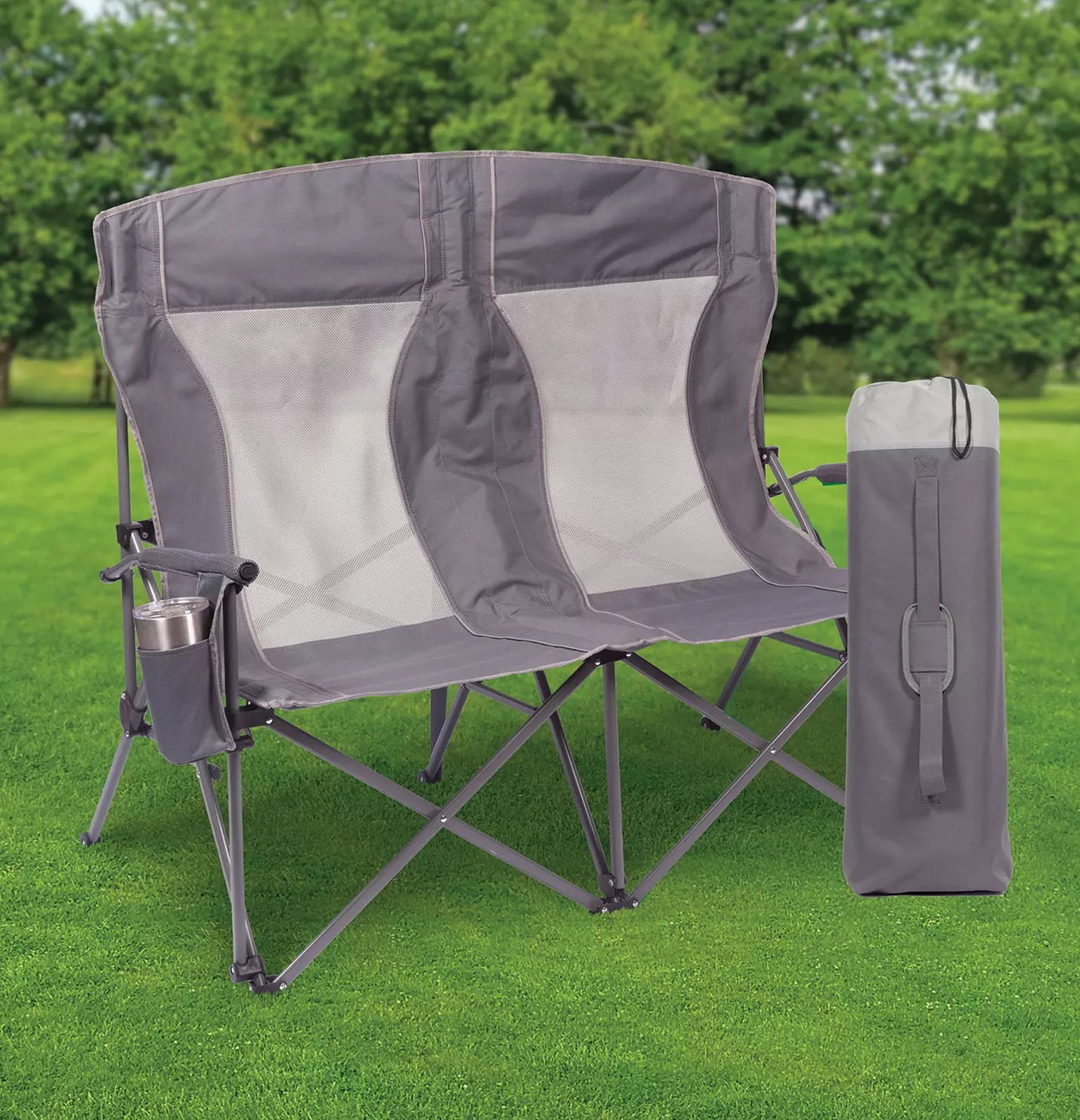 Built with padded arms and headrest, cool breathable moisture-wicking mesh, durable polyester fabric on a rugged steel frame, this chair has a 650 lbs. weight capacity, 325 lbs. per seat. The double arm chair folds compactly for storage or transport, and includes a carry bag with an adjustable carry strap for additional convenience.