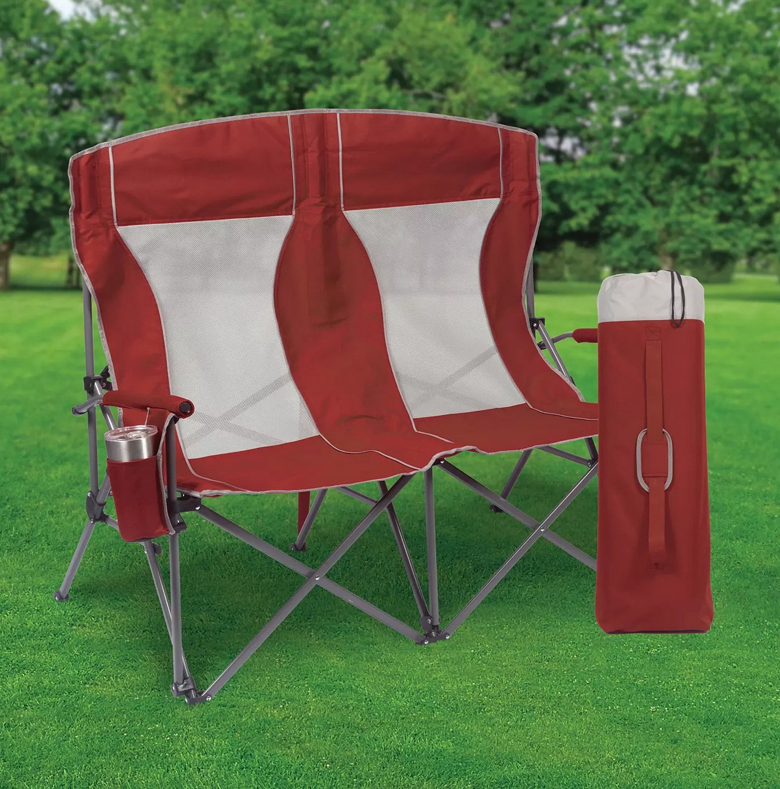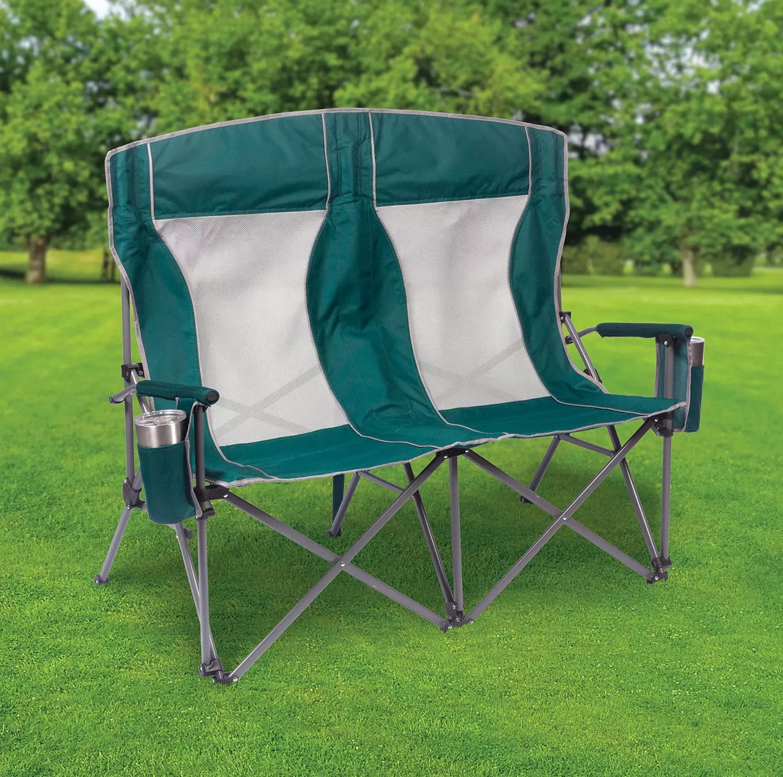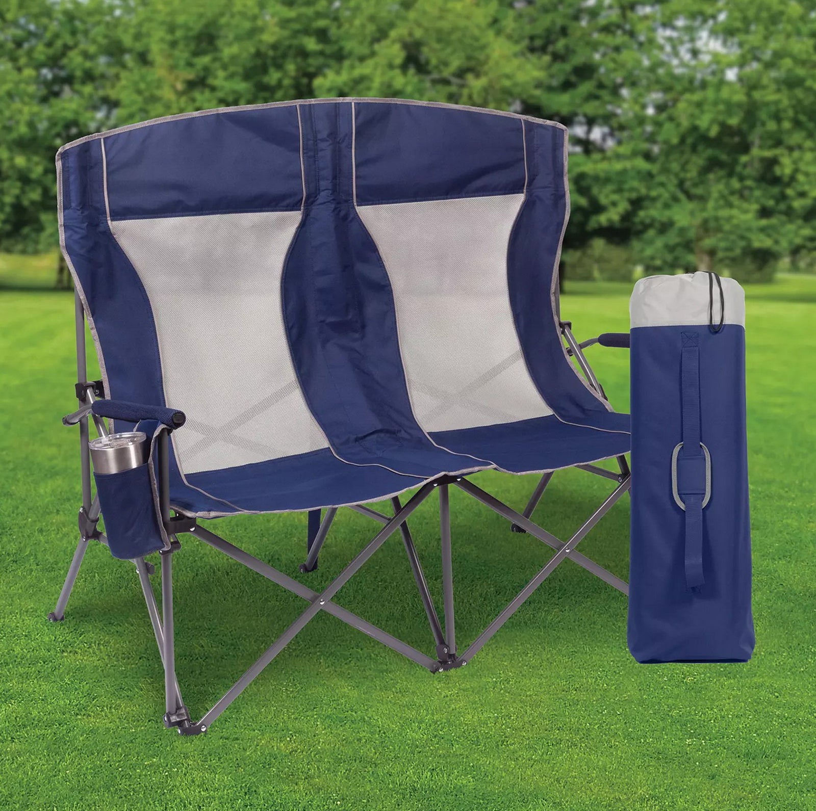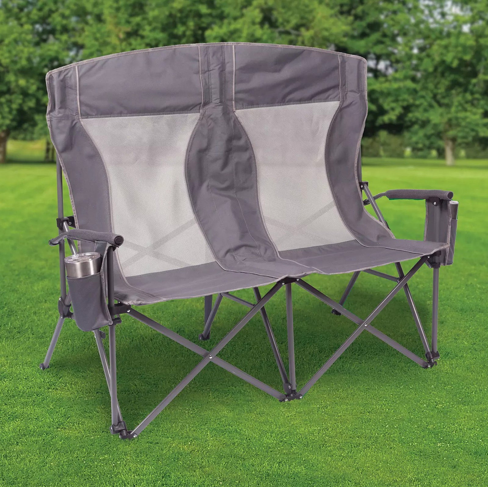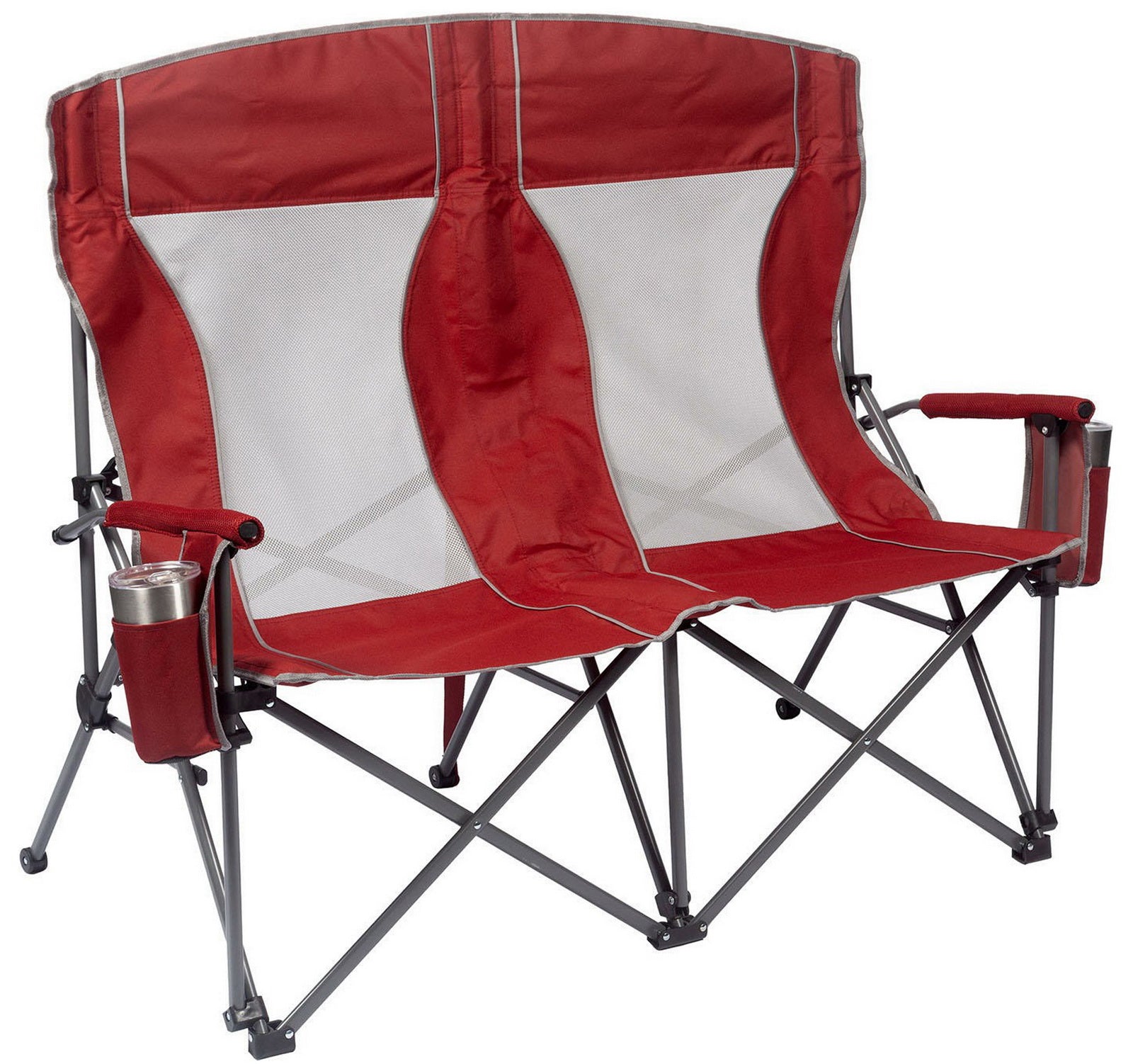 Built with padded arms and headrest, cool breathable moisture-wicking mesh, durable polyester fabric on a rugged steel frame, this chair has a 650 lbs. weight capacity, 325 lbs. per seat. The double arm chair folds compactly for storage or transport, and includes a carry bag with an adjustable carry strap for additional convenience.
