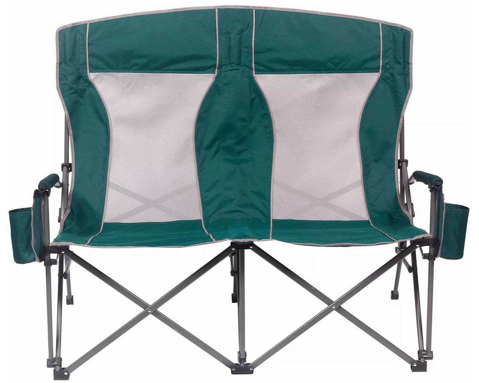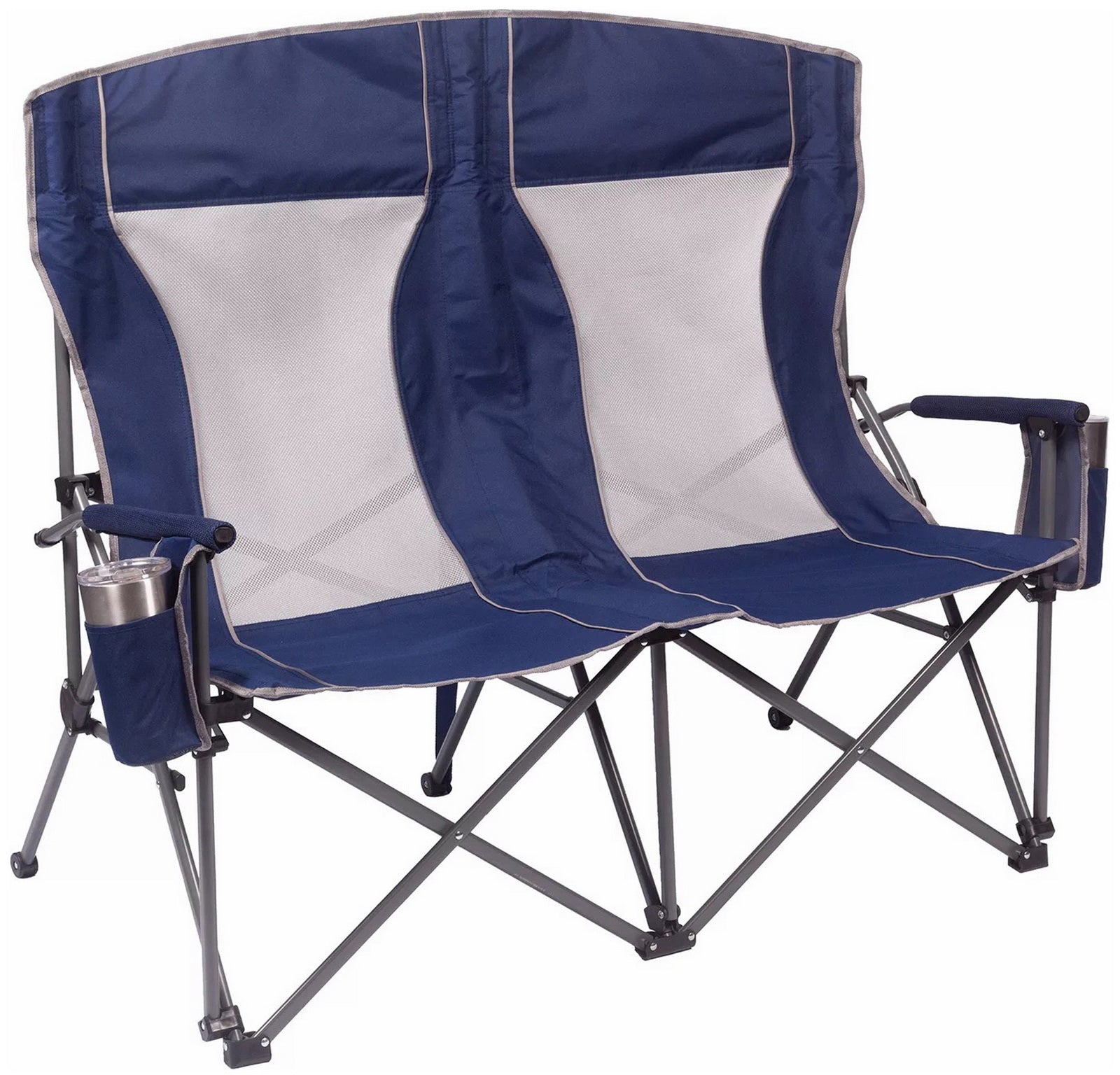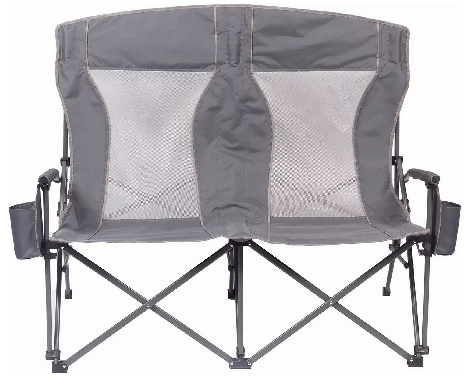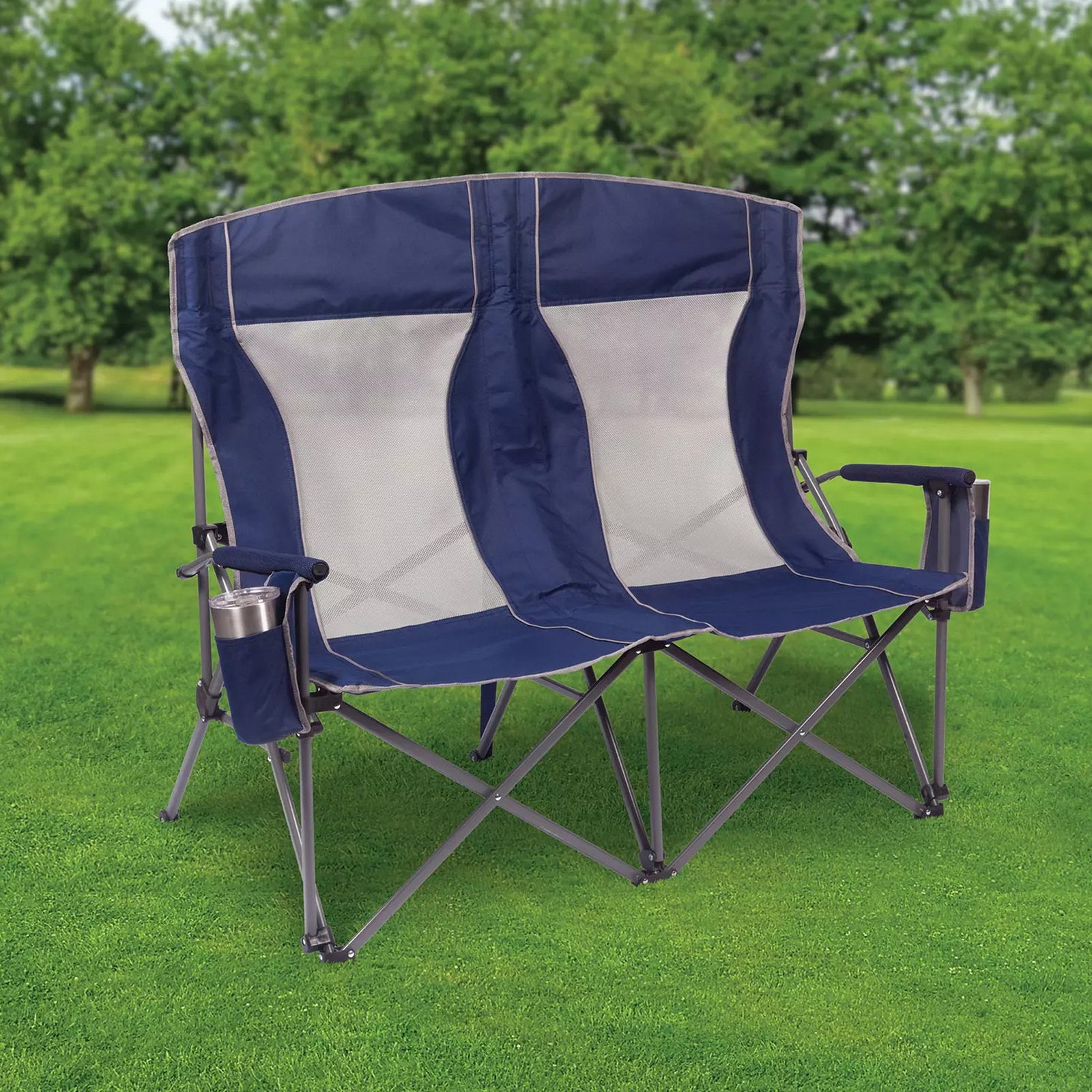 Built with padded arms and headrest, cool breathable moisture-wicking mesh, durable polyester fabric on a rugged steel frame, this chair has a 650 lbs. weight capacity, 325 lbs. per seat. The double arm chair folds compactly for storage or transport, and includes a carry bag with an adjustable carry strap for additional convenience.
