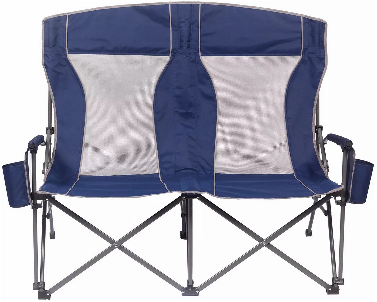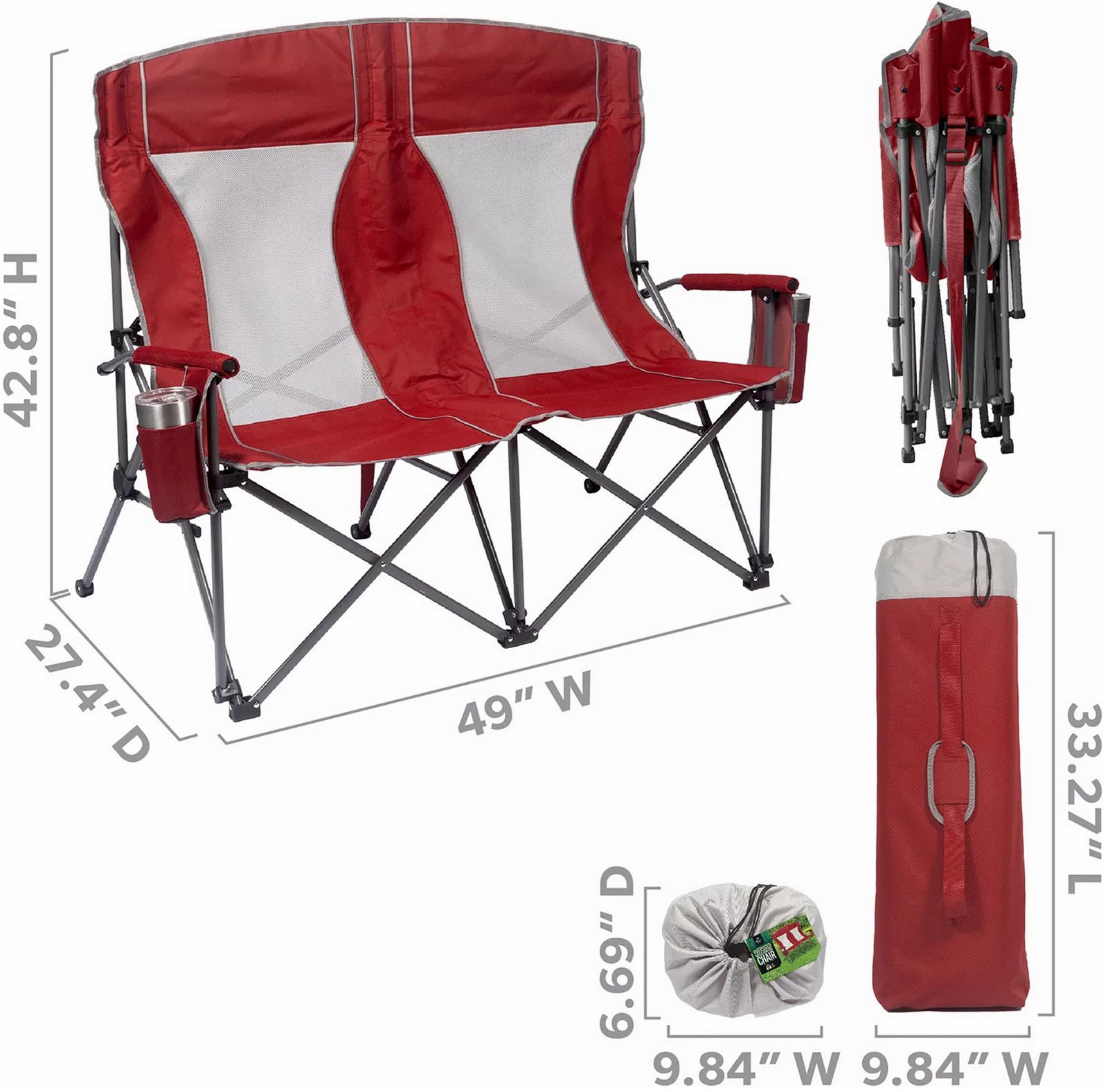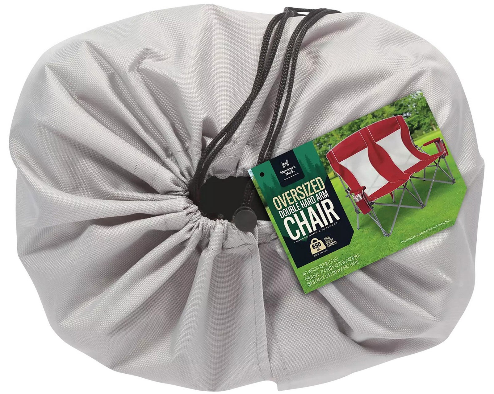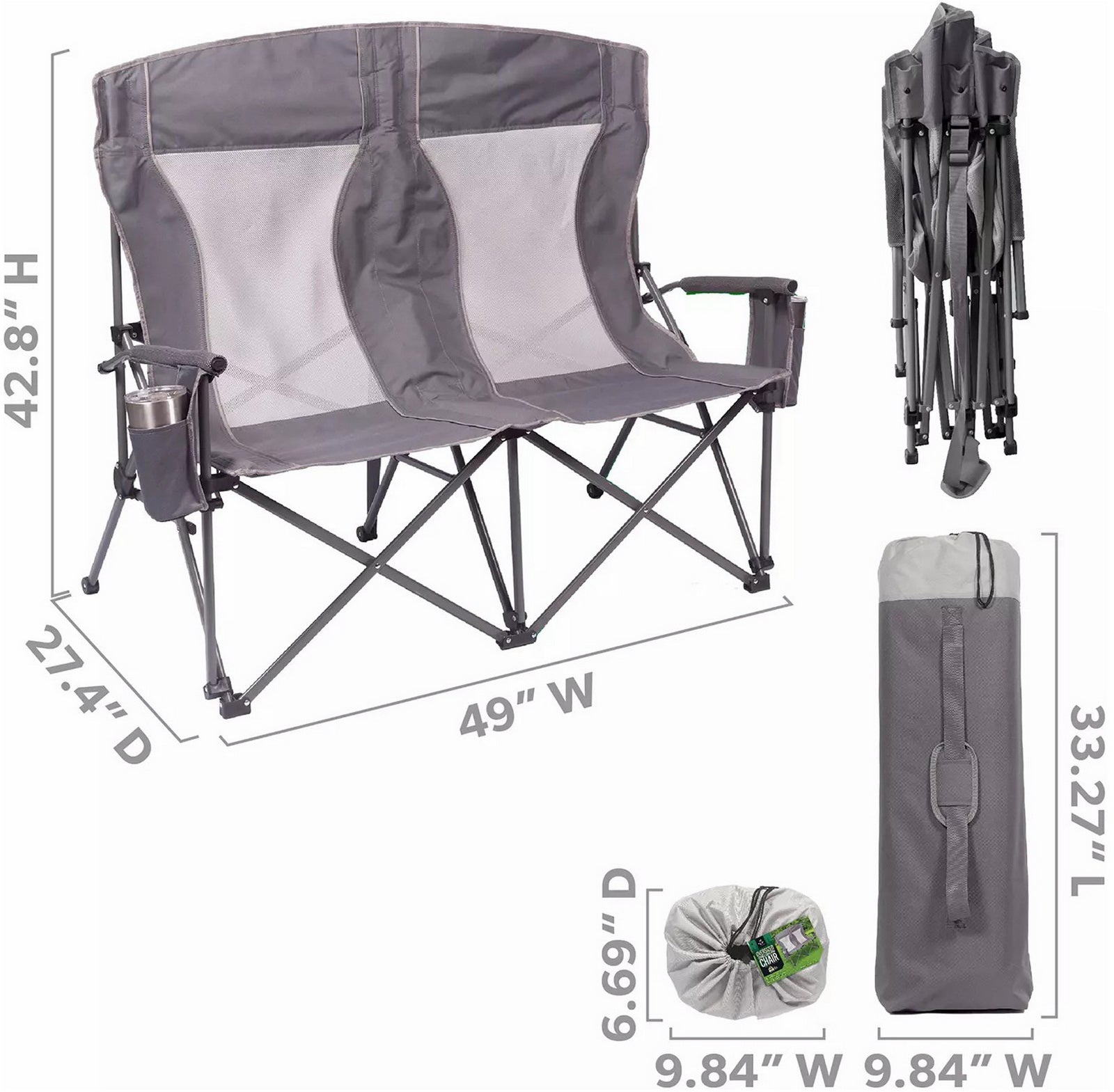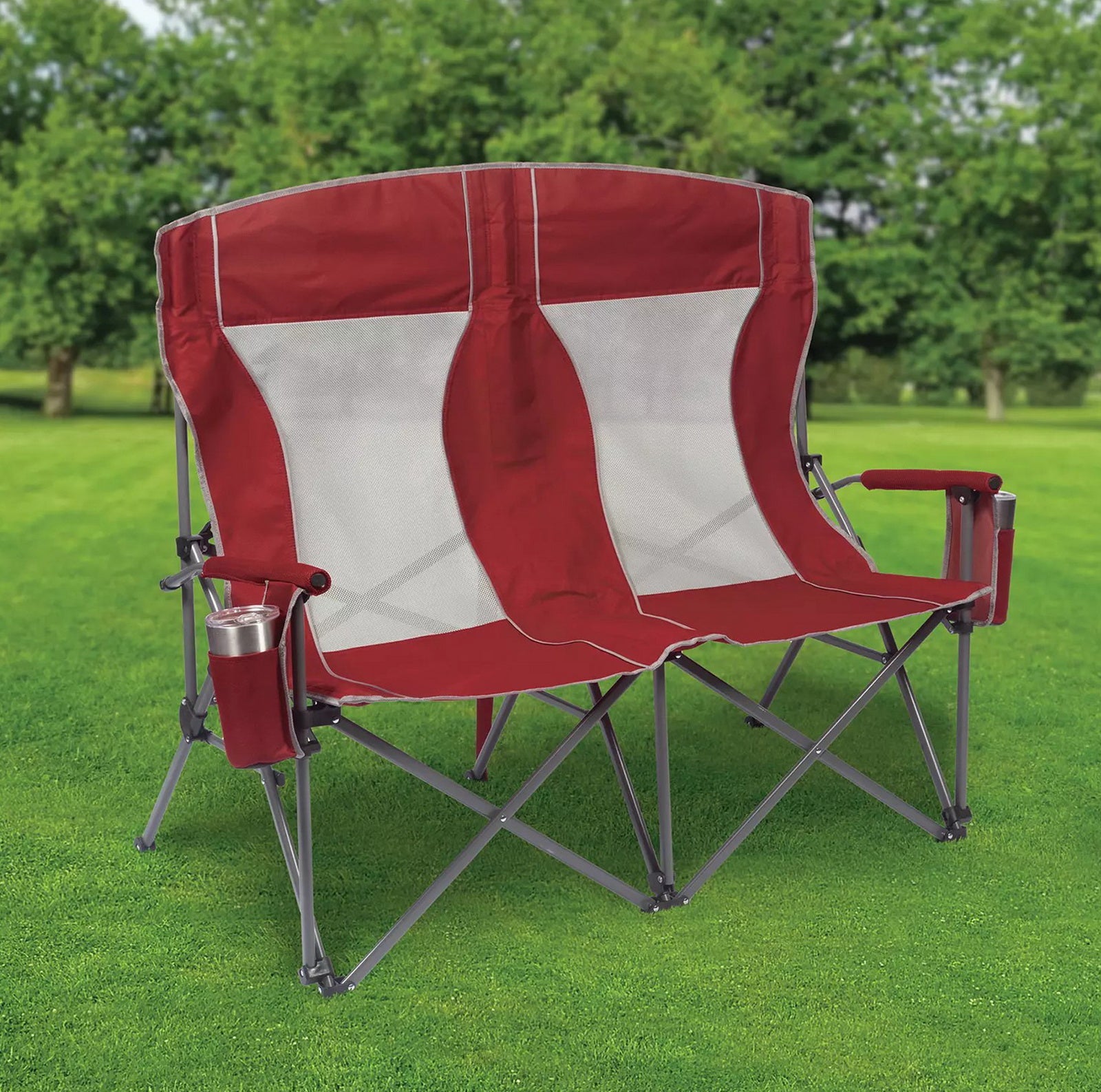 Built with padded arms and headrest, cool breathable moisture-wicking mesh, durable polyester fabric on a rugged steel frame, this chair has a 650 lbs. weight capacity, 325 lbs. per seat. The double arm chair folds compactly for storage or transport, and includes a carry bag with an adjustable carry strap for additional convenience.