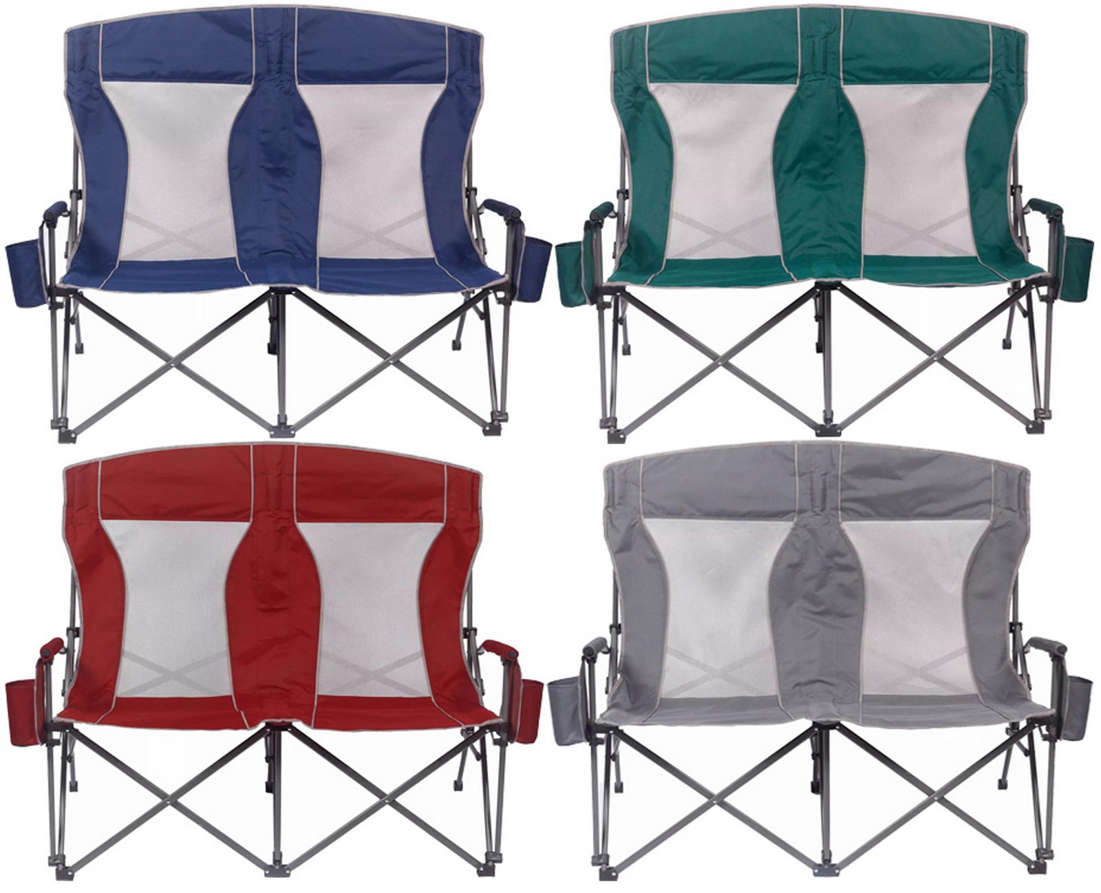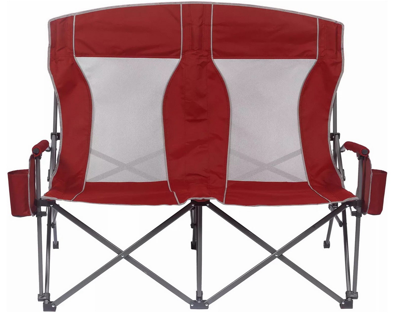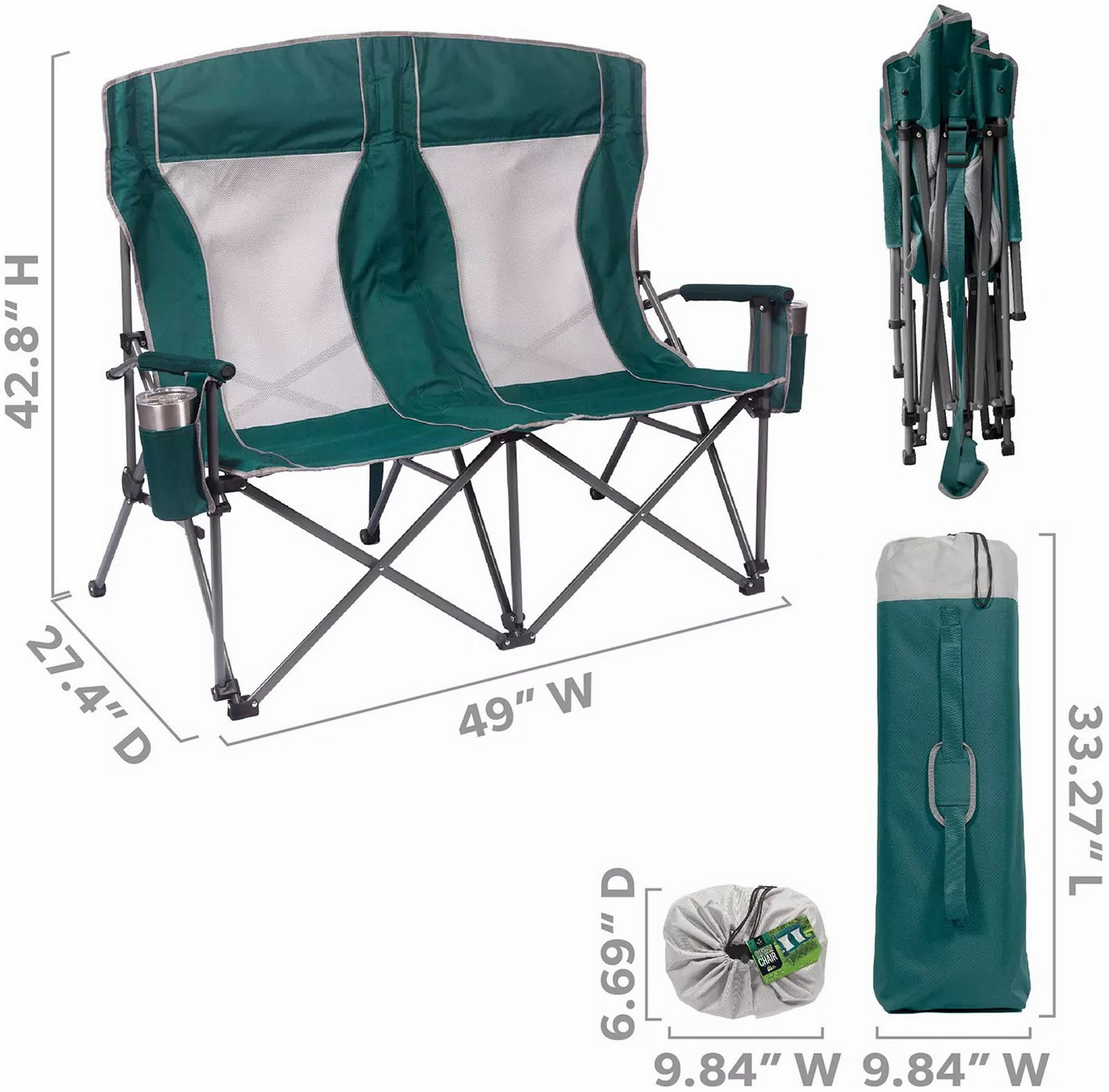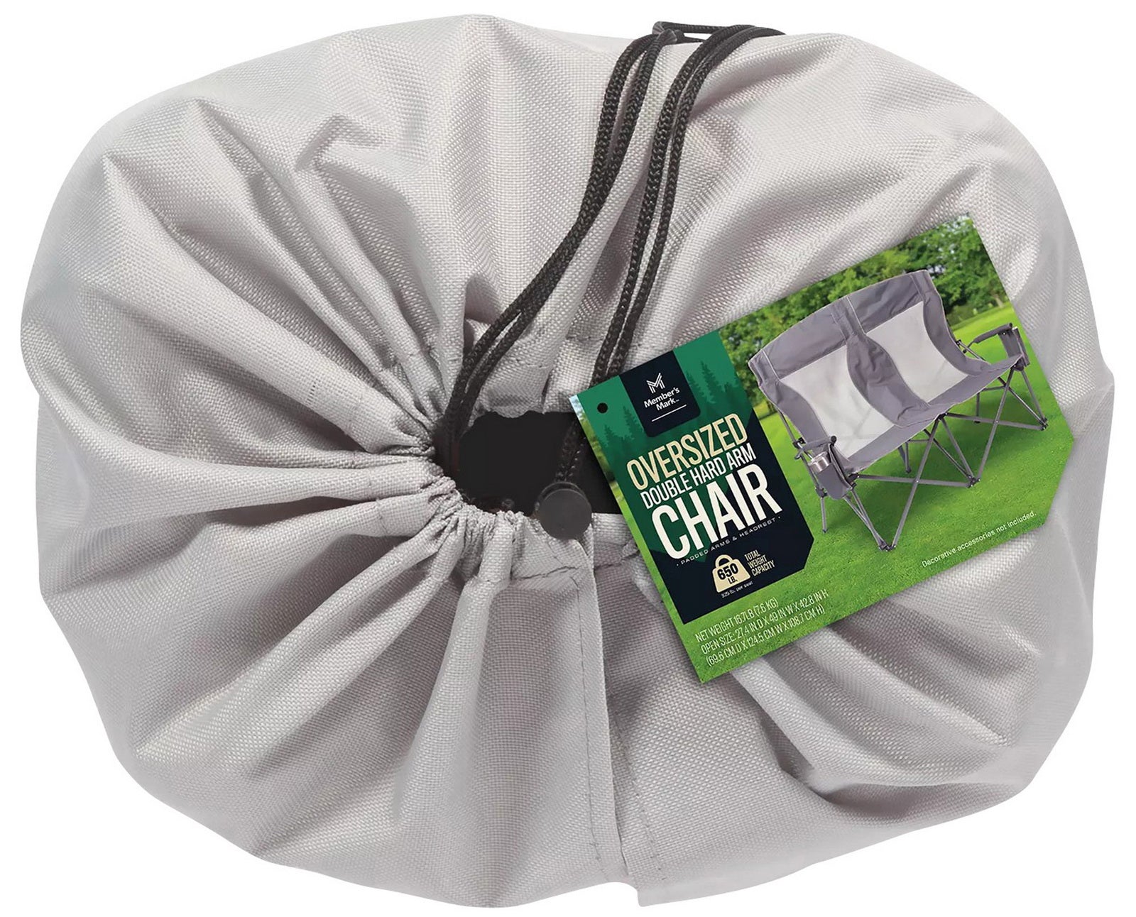 Built with padded arms and headrest, cool breathable moisture-wicking mesh, durable polyester fabric on a rugged steel frame, this chair has a 650 lbs. weight capacity, 325 lbs. per seat. The double arm chair folds compactly for storage or transport, and includes a carry bag with an adjustable carry strap for additional convenience.
