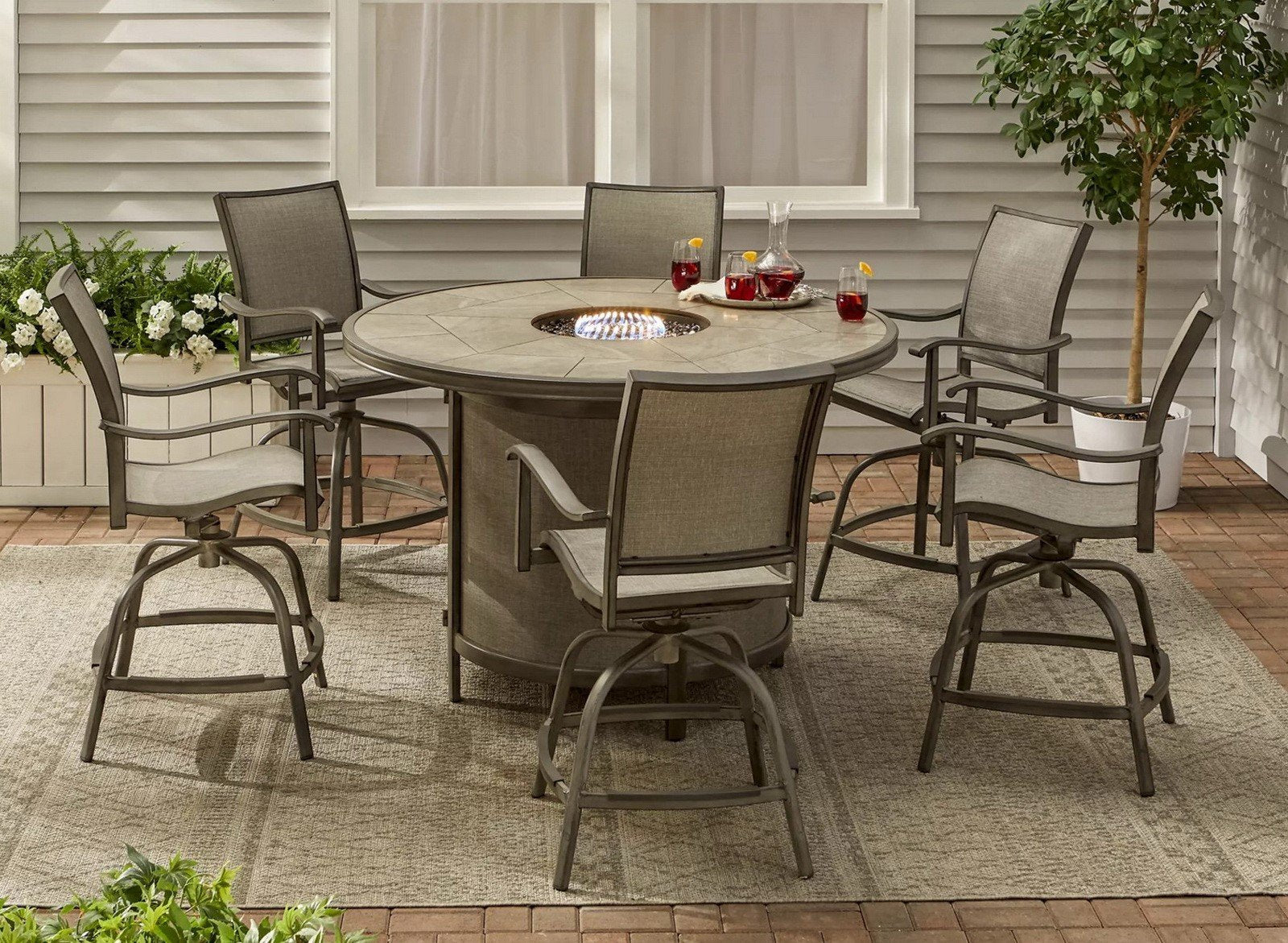 - Includes six sling bar stools, one 58" rd grouted tile top fire pit