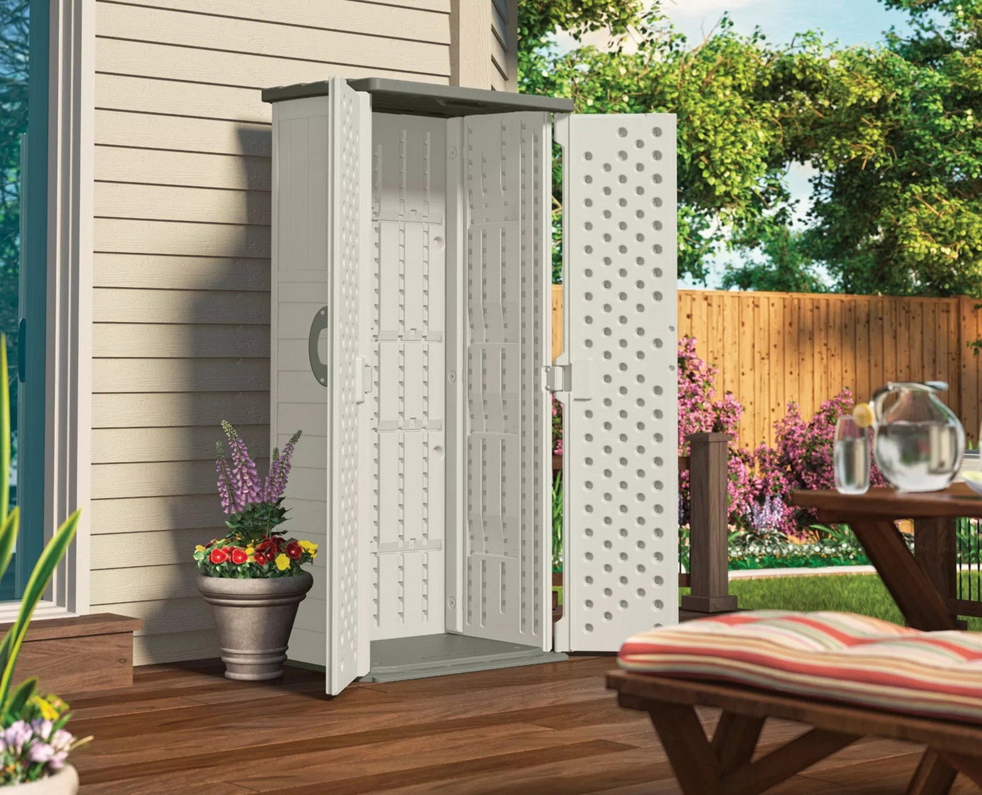 Ideal for compact spaces such as porches, patios and balconies, this versatile Suncast Vertical Storage Shed offers countless organizational opportunities. From storing long-handled tools to ladders, gardening gear, and more, this 22 cu. ft. storage solution offers endless everyday utility. The durable multi-wall resin construction allows for year-round use and easy maintenance, and the customizable interior supports up to four shelves (not included) for even more efficient organization.