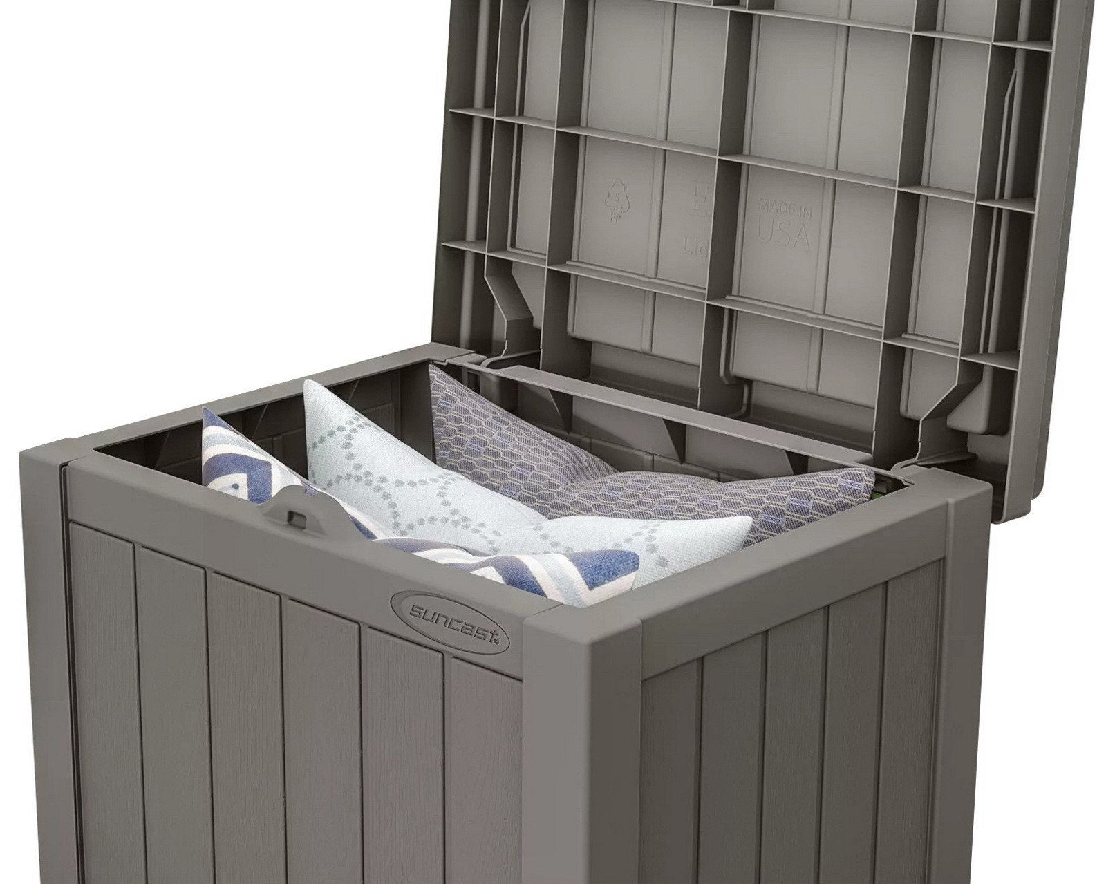 The Suncast 22 Gallon Small Deck Box with Storage Seat combines seating and convenient storage. The durable resin construction stands up to heavy use and is easy to maintain. The small size makes it ideal for your laundry room or garage. Ideal for storing cushions, garden supplies, or winter accessories, it features a reinforced lid that offers extra seating and a durable resin construction is built to last.