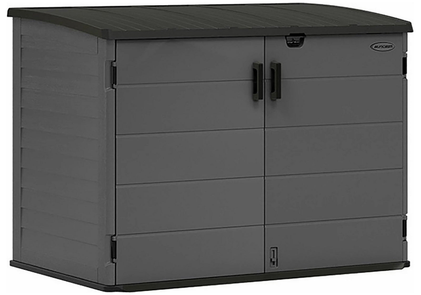 At 70 cu. ft., the Suncast Stow-Away Wide Opening Heavy Duty Horizontal Shed is the perfect solution for hiding your unsightly garbage cans and keeping all your lawn and garden equipment organized. The storage space is sufficient for holding up to two 96-gallon waste containers or it can house other items such as furniture cushions, bicycles, firewood, and gardening supplies.